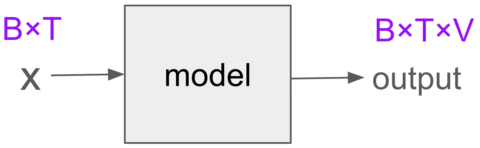 B stands for batch size, T stands for length of sequence in tokens, and V is vocabulary size. I showed an example where B was 32 and T was 2048 resulting in a total of 65,536 tokens going into the model in a single input. This is in fact how the inputs and outputs are shaped.
