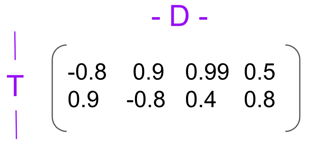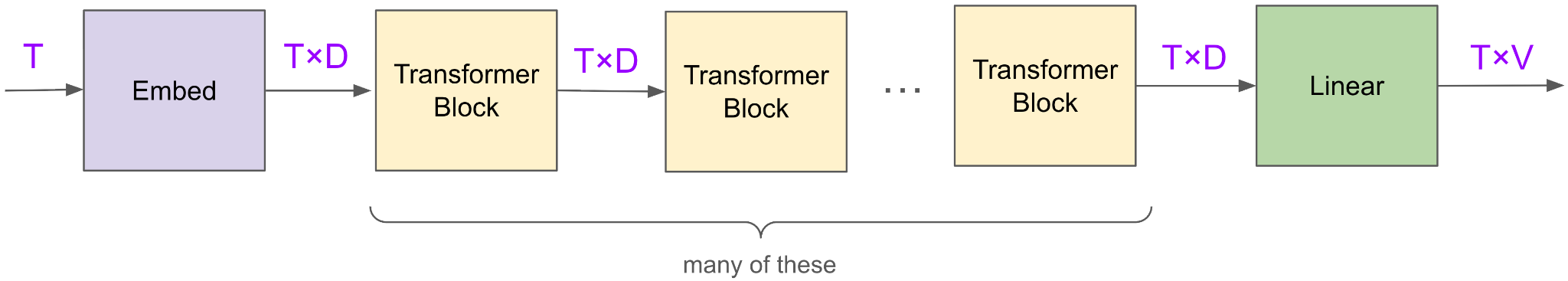 That’s it. It’s just a bunch of numbers. You can think of a vector as a row in a matrix. And now with this terminology we can say that we turn a sequence of T tokens into a sequence of T vectors each of size D. Each successive transformer block then takes in T vectors of size D and outputs another T vectors of size D. The final linear layer takes in T vectors of size D and outputs T vectors of size V.