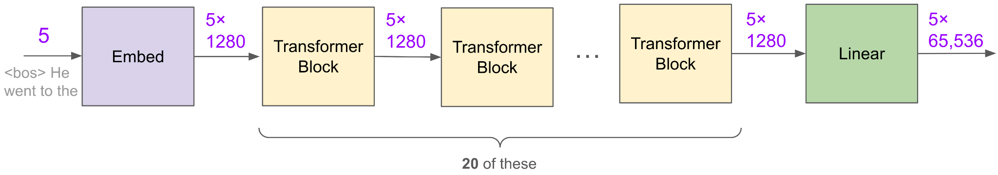 Let’s put example dimensions in to make it easier to follow. I’ll assume my input is a sequence of five tokens (e.g. “<bos> He went to the” ). I’ll use the dimensions from my 20-layer model, the version of the model I trained before I started writing this book. I haven’t explained what “D” is yet but we’ll come to that.