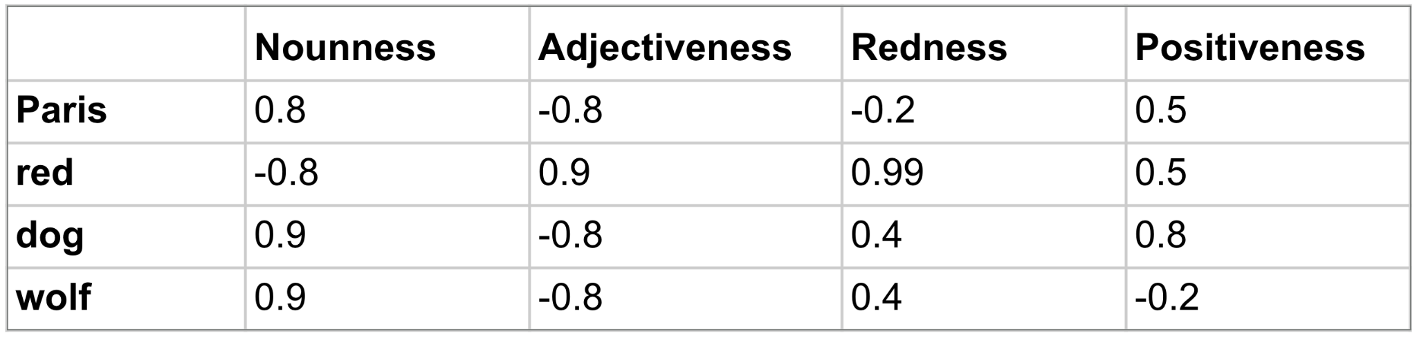 Initially the numbers will be random. They will take on meaning during training, although the meaning won’t be nearly as obvious as in my contrived example. For example, you’re unlikely to look at the first dimension and say, aha, that’s nounness. (For the sake of how this approach fits with other approaches you may have heard about, it is also possible to start with pre-trained embeddings and keep them locked during training.)