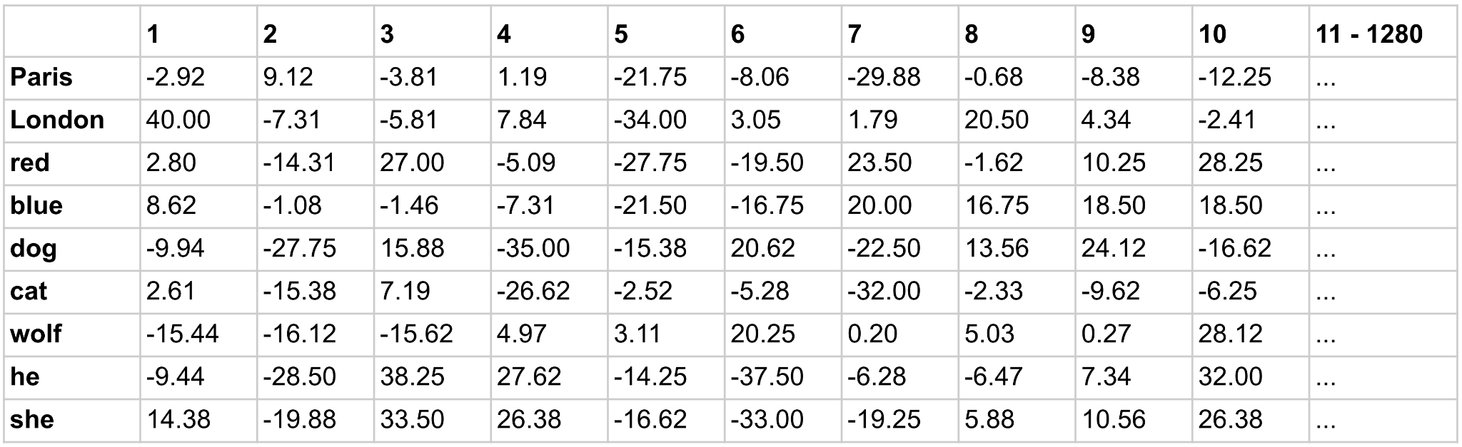 So what does the embedding module actually do? Think about token 6237 from our text generation example, “ Paris.” The number 6237 is just an identifier and has no more or less meaning than any other number. As humans, though, even in isolation with no other words around it, we associate quite a bit of meaning with “Paris”: noun, city, France, Europe, beautiful, baguette, old. Pandora needed to characterize song ID 153,432 along many dimensions (e.g. genre = pop, instrumentation = acoustic-driven, vocal presence = male vocalist) so their personalized radio stations could smartly pick next songs. We need to do something similar with our tokens. Here’s a somewhat silly example of how that could look: