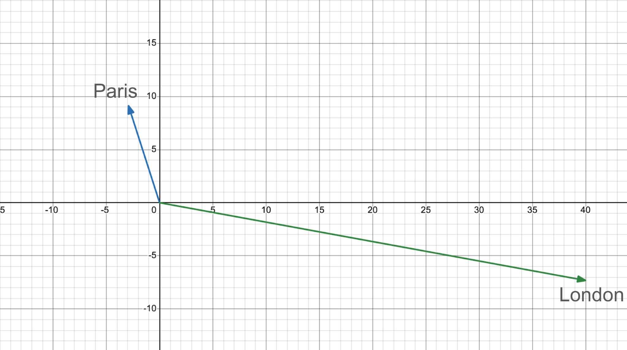 We’re not helpless though. If we only cared about the first two dimensions, for example, you could draw a vector representing Paris from the origin to (-2.92, 9.12) and another representing London from the origin to (40, -7.31). You could consider the angle between those two vectors to be a measure of how similar they are.