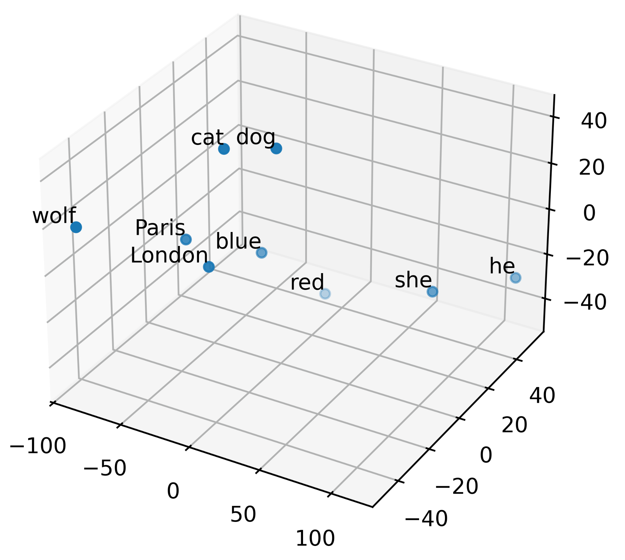 Now I’m getting convinced that my embeddings actually do mean something! Read across on the “Paris” line. What’s most similar to “Paris” besides Paris itself? “London.” What’s most similar to “he”? “She.” The two adjectives are similar. The two pronouns are similar. The three animals are similar and “cat” is closer to “dog” than to “wolf.”