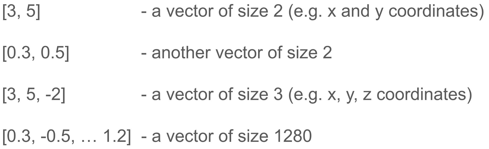 I’ve mentioned “1280 numbers” a few times. It’s time to introduce the term vector because it’s going to make it easier to talk about those numbers. In chapter 5 I described a matrix as a bunch of numbers organized into rows and columns. In chapter 8 I said that a matrix is a two-dimensional tensor and that we can use the term tensor no matter how many dimensions we have. A vector is specifically a one-dimensional tensor. Let me show you a few examples.