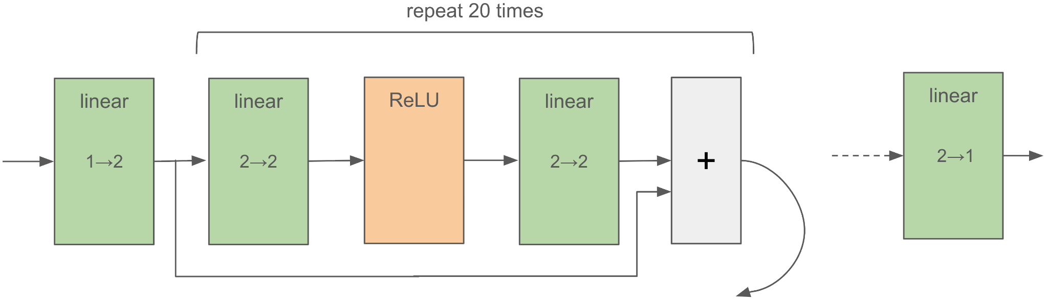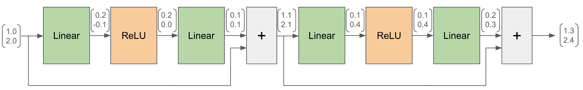 You saw linear and ReLU modules working together starting in hedgehog model #4 (see figure 10.18). What’s new here are the two skip connections. The output of the first linear / ReLU / linear sublayer gets added to the input and fed into the second linear / ReLU / linear sublayer, where the same thing happens again. By “added,” I’m not referring to anything abstract. It’s literally an element-wise addition.