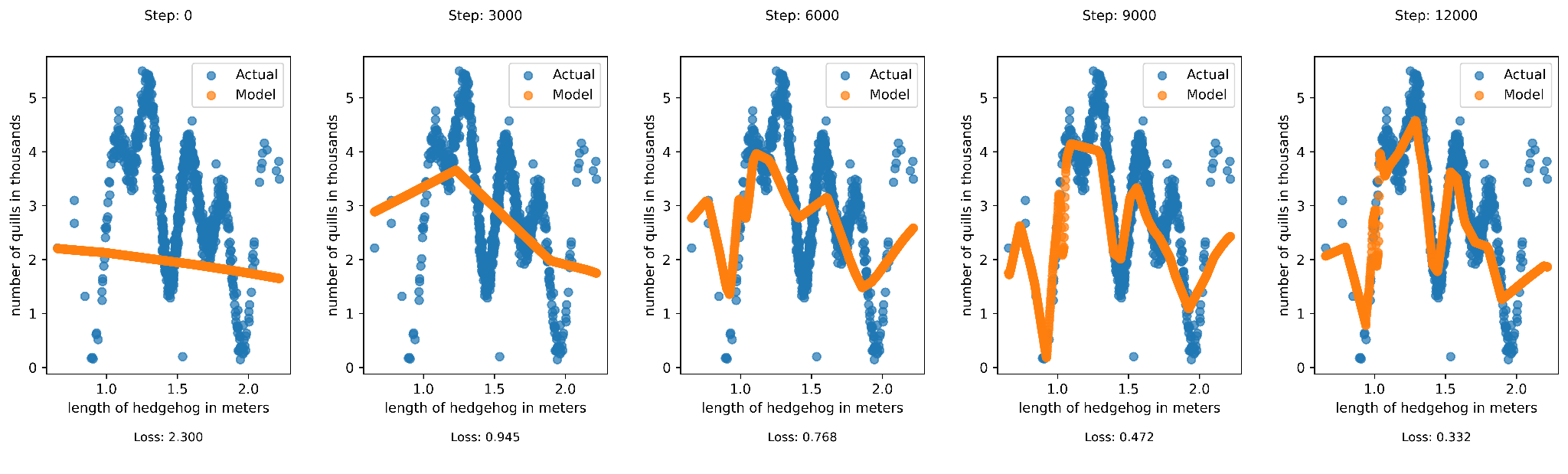 I plotted the model during training after the 0th step and then every 3,000 steps up to step 12,000.