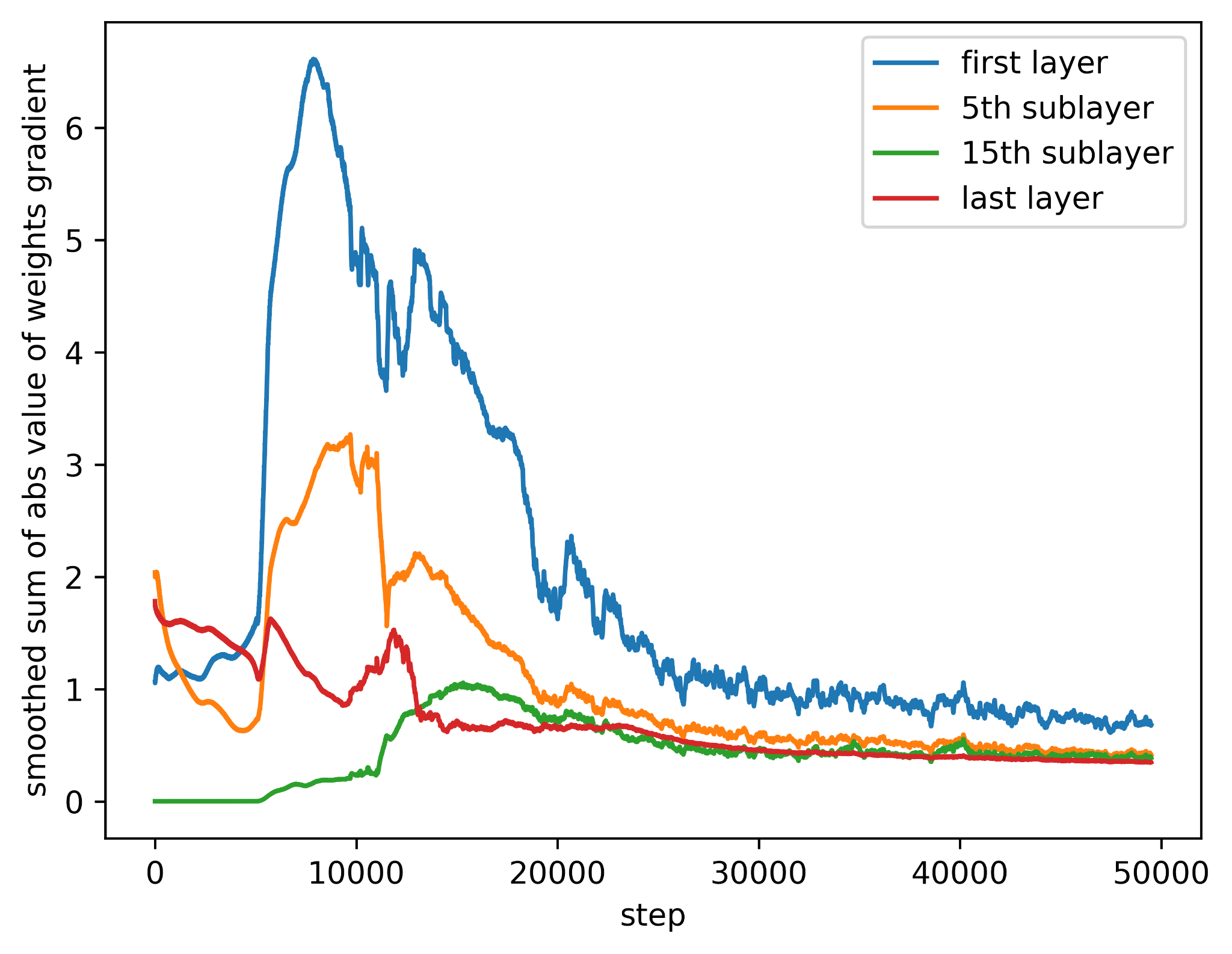 The training appears under control as the model learns the patterns in the data. When I pop open the training hood, I can see that the gradients are behaving nicely. During backprop, a gradient will be computed for all of the parameters of all of the layers. I recorded the sum of the absolute values of the gradients of the two weights in the first layer, the two weights in the last layer, and the four weights in two of the sublayers at every step of training. Here are those sums smoothed and plotted: