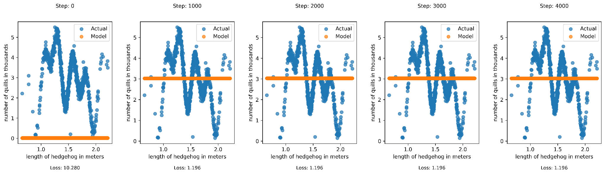 The gradient for sublayers 18 and below (not shown) vanish after around 25 steps leaving training with only the five weights in layers 19, 20, and the final layer to adjust. It’s not surprising that the model gets stuck on predicting the mean number of quills, the same as hedgehog model #1. As bad, the training process is very sensitive to the randomly initialized parameters and the gradients can vanish even sooner. For example, just now I changed my random seed and reinitialized my model, and all gradients from the 19th sublayer and below vanished immediately. You can imagine how this happens with ReLU and only two weights in each linear layer, but the same problem occurs in less sudden ways with bigger models.