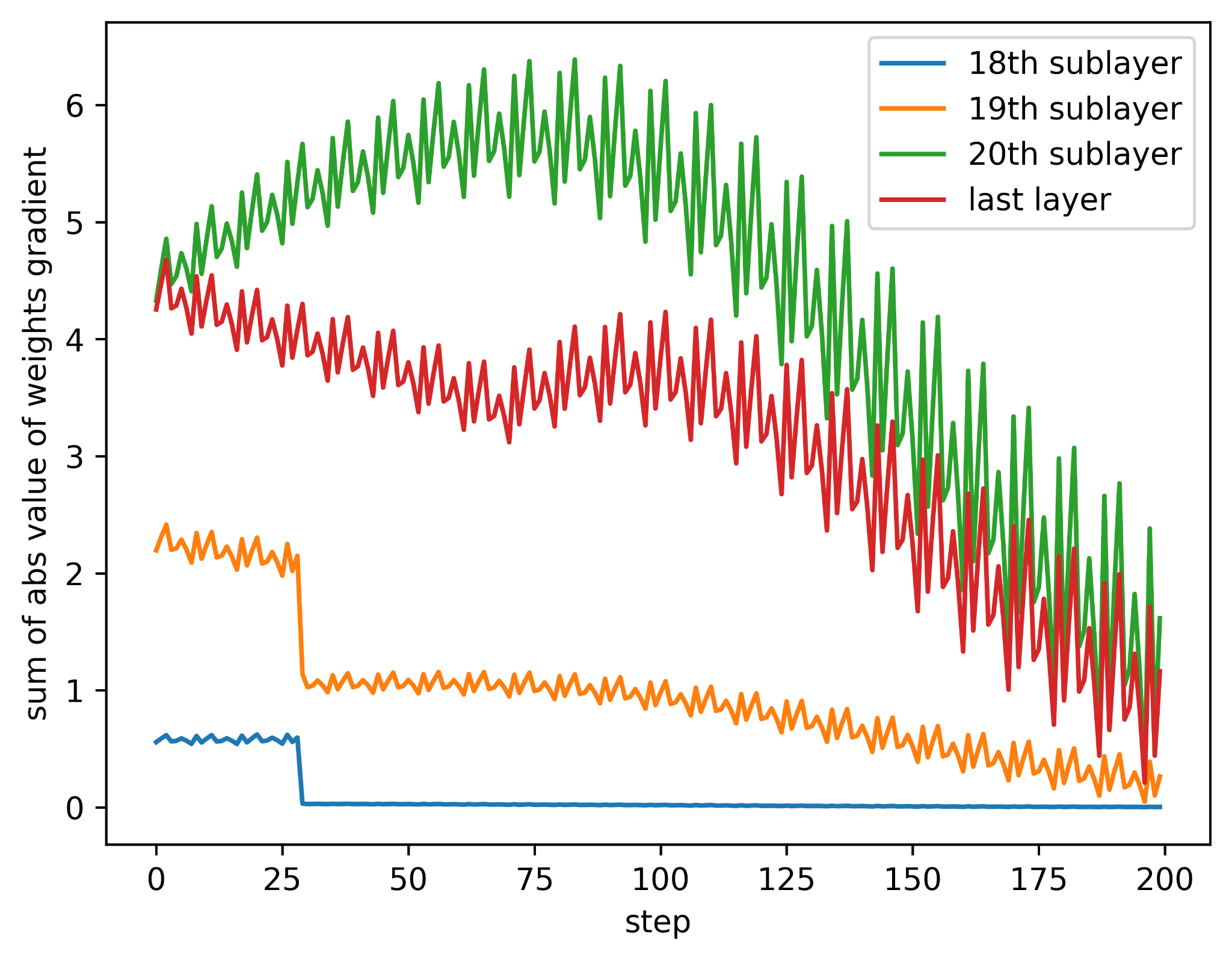 You can see from both the model plot looking like a horizontal line and the loss not budging from around 1.2 that the training gets stuck. It is unable to learn how to adjust parameters in a meaningful way. Now let’s look at the gradients for the final layer and the last few sublayers over the first 200 training steps: