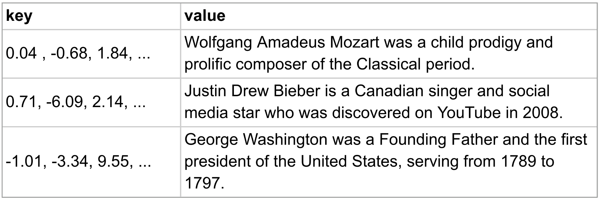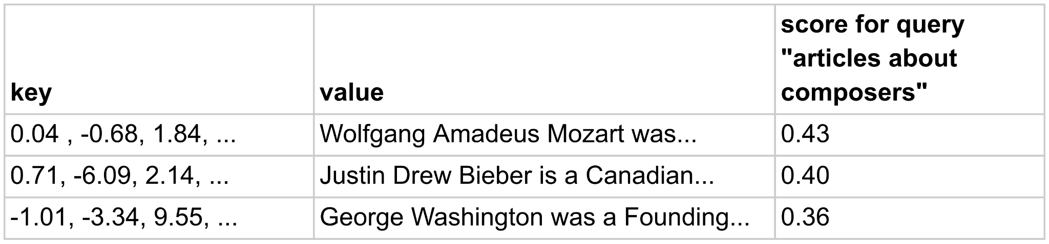 The key is a long vector of numbers and the value is a document. The idea is that the key represents the document in much the same way an embedding represents a token as described in chapter 11. Let’s say our query is “articles about composers” which we’ll also turn into a vector. Instead of the database doing an exact match on key, it will score the similarity between the query and each key, using, for example, the same cosine similarity calculation I used to compare embeddings in chapter 11 (see table 11.3). Example:
