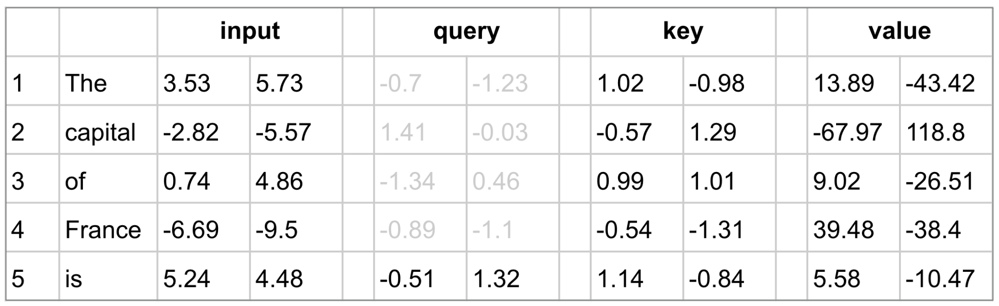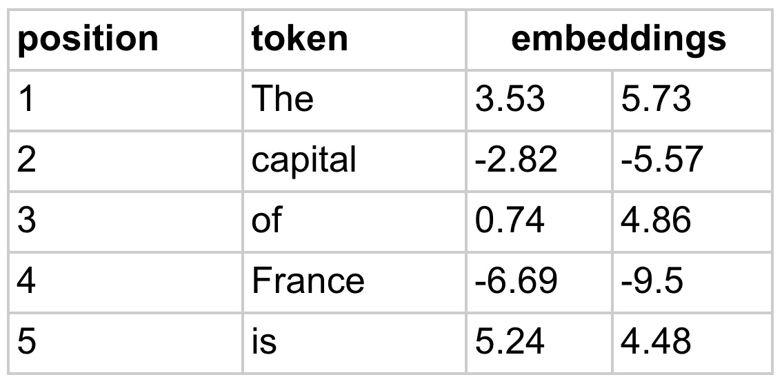 So how are we possibly going to get the model calculations to do something like emitting queries, keys, and values, then matching up queries and keys, and then pulling in values? Suppose our sequence so far is “The capital of France is” and, to keep things a little easier to imagine, let’s say we’re in the first transformer block and our embeddings only have two dimensions (which would never actually work). So here’s the input:
