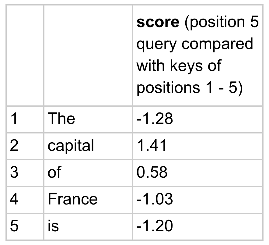 The black vectors are our keys. The red vector is the query for the last position. The query is close to “capital” indicating that the “is” position is very interested in the “capital” position and will want to pull information in from its value.