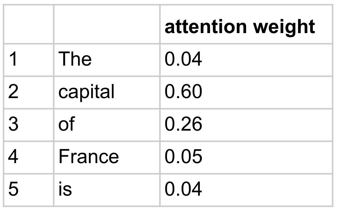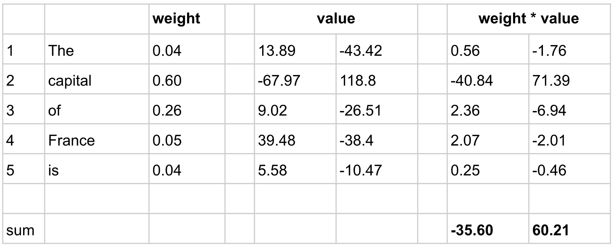 Coming out of this, position 5 contains the vector [-35.60, 60.21]. (Again, in reality the vector would have way more numbers.) This vector represents information about the entire sequence that is relevant at this position to predicting the next token: “Paris” we hope.
