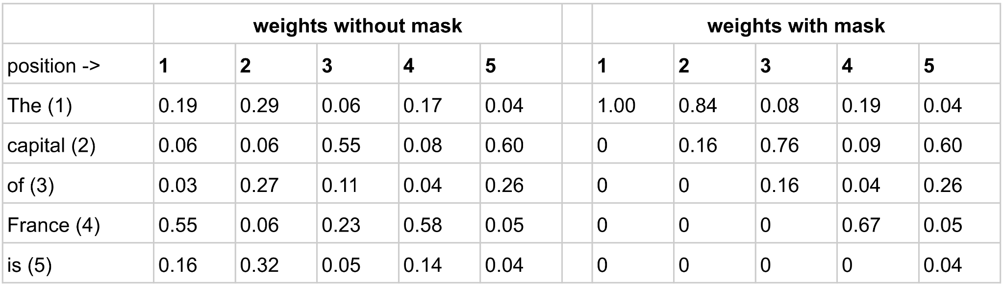 Notice that in the masked version, for position 1, 100% of the weight falls on position 1. Think about that for a second. It’s the only option because position 1 is not allowed to see positions 2–5. For position 2, 84% of the weight falls on position 1, 16% on position 2, and none on 3–5. When the weights for position 2 get multiplied by the values for all positions, no information from position 3, 4, or 5 will get blended in.