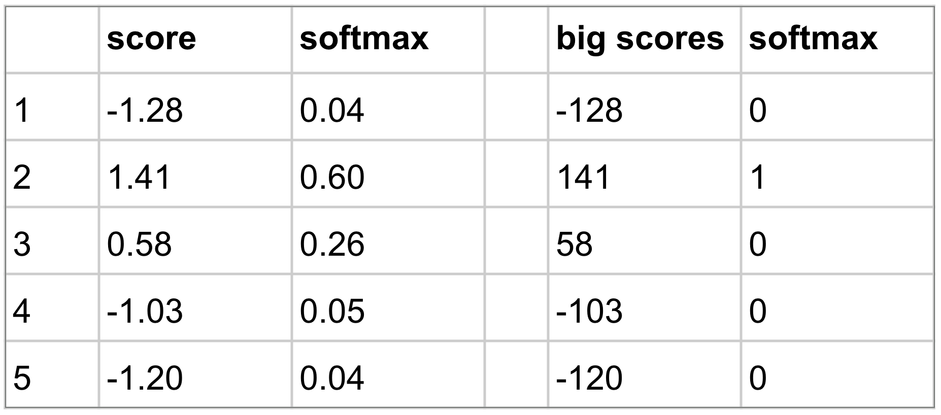 The big scores are 100 times the non-big scores, and with these big numbers softmax assigns all of the weight to position 2. We do not want that! We’re trying to blend information from multiple positions. Look back at table 8.10 as a reminder for how the softmax calculation works. If you play with a few numbers you’ll see why it behaves poorly with big ones.