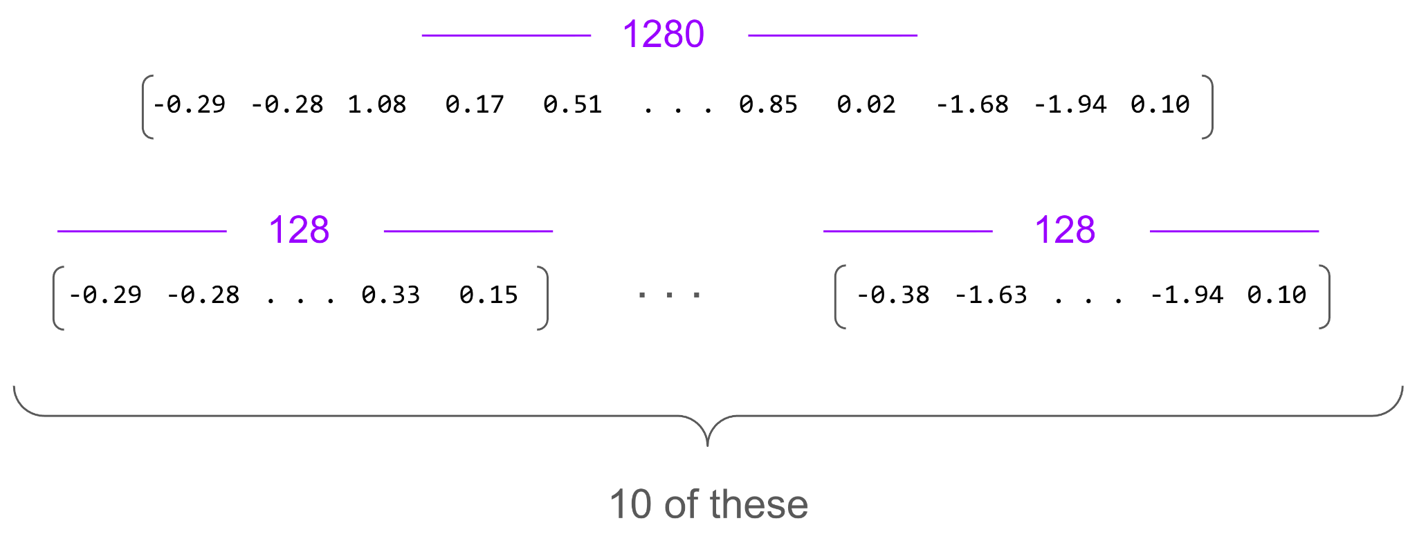 As we talk this through, let’s think of our input as being a tensor of size 100×1280 corresponding to a sequence of 100 positions each represented by a vector with 1280 dimensions. (For scaled dot product attention above it was helpful to think of each vector as having size two, but that’s too small to see things here.)