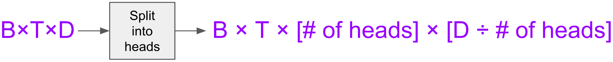 Here’s something you haven’t seen yet: split into heads. What it does is straightforward and doesn’t involve learning any parameters. Say we want to split into 10 heads: