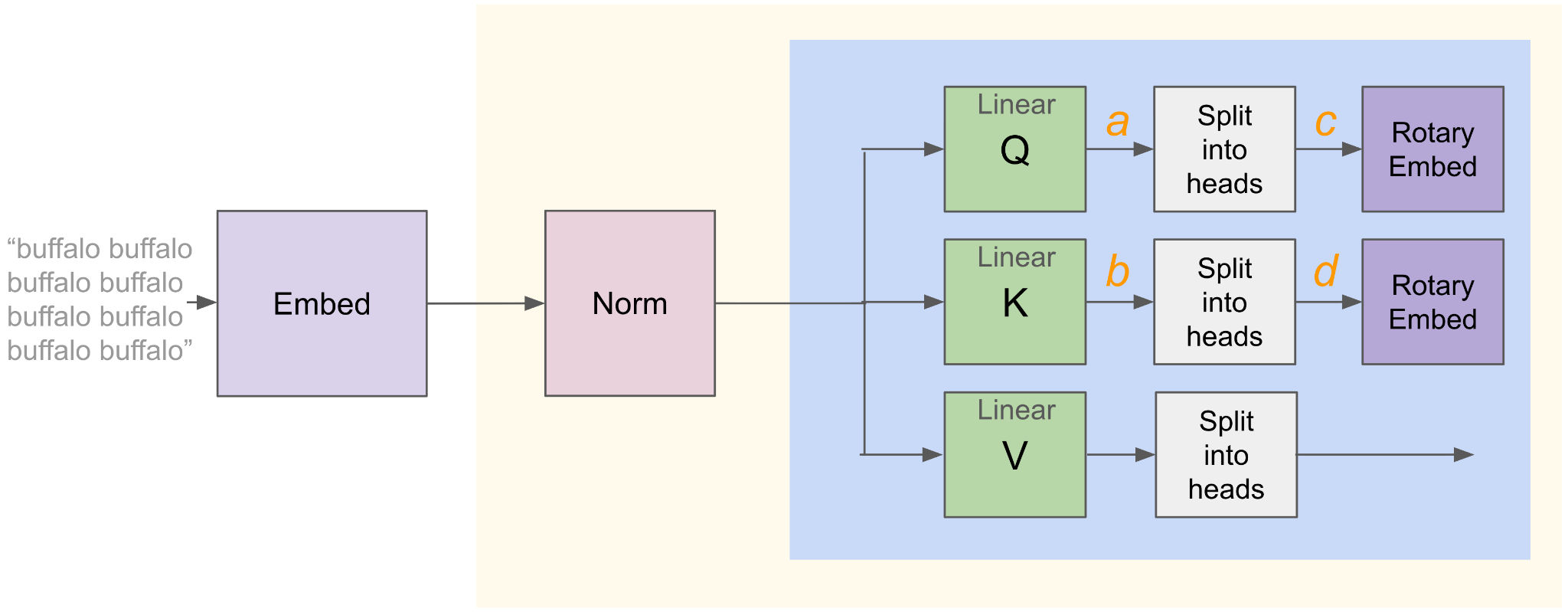 I’m going to tokenize that sentence (not worrying about capital vs lowercase B) which gives me eight identical tokens. I’m then going to convert these tokens into an embedding, normalize, go through my Q and K linear transforms, and then break the resulting size D vectors into 10 heads. Put another way, I’m going to stick “buffalo buffalo…” into my full model and stop just before we reach the rotary embeds in the first transformer block. You can follow along in figures 11.3, 13.2, and 14.7 above but that will be tedious, so let me pull it all together into a single diagram: