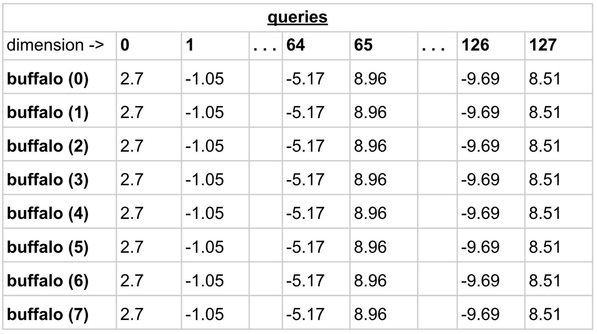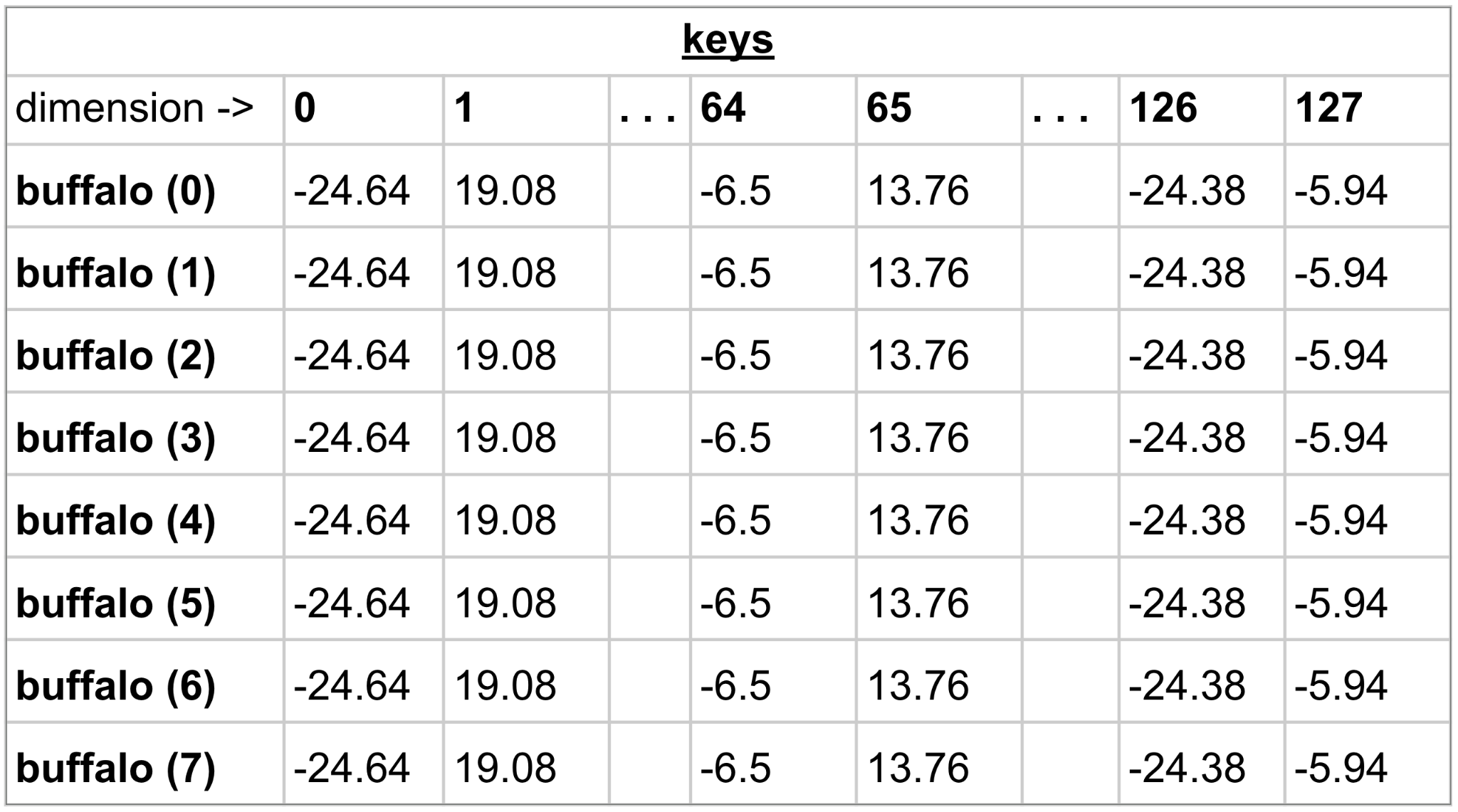 You’ll notice that all of the keys are identical. This is expected. We started with eight of the same token (“buffalo”), turned it into eight identical embeddings, and put each through an identical linear transformation. We could have a sequence of 5,000 “buffalo” and all the keys would still be identical. As you’ll see, once we go through the rotary embed, they no longer will be.