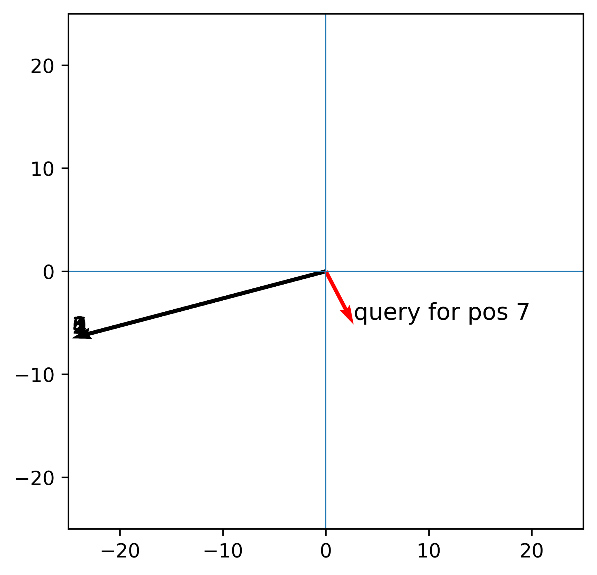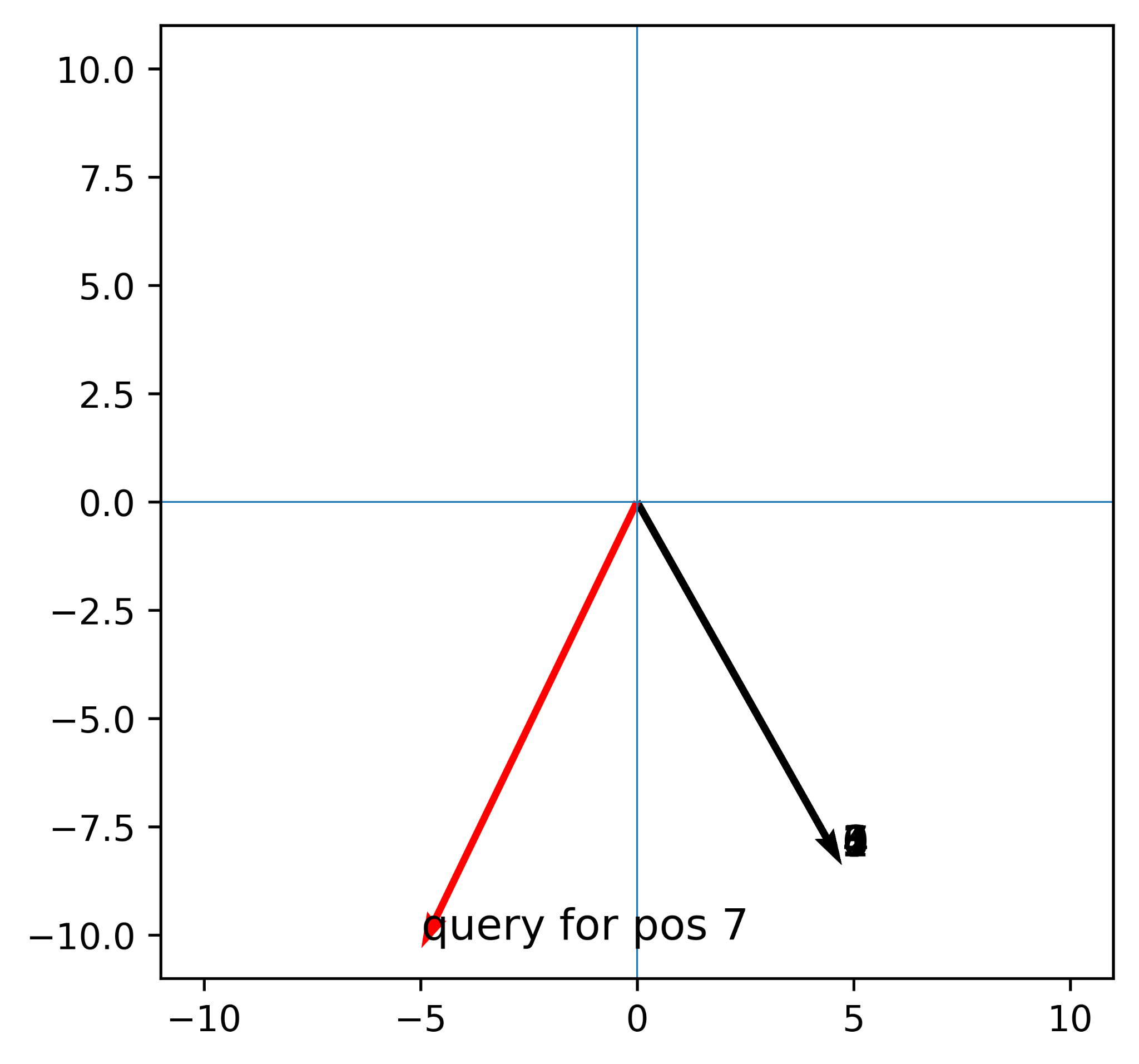 Notice that the angle between the query for position 7 and key for the position two behind it (position 5) in figure 15.8 is the same as the angle between the query for position 6 and the key for position 4 in this figure 15.9. This is expected and desired because we only care about relative position (in this contrived case where the tokens in each position are identical.)