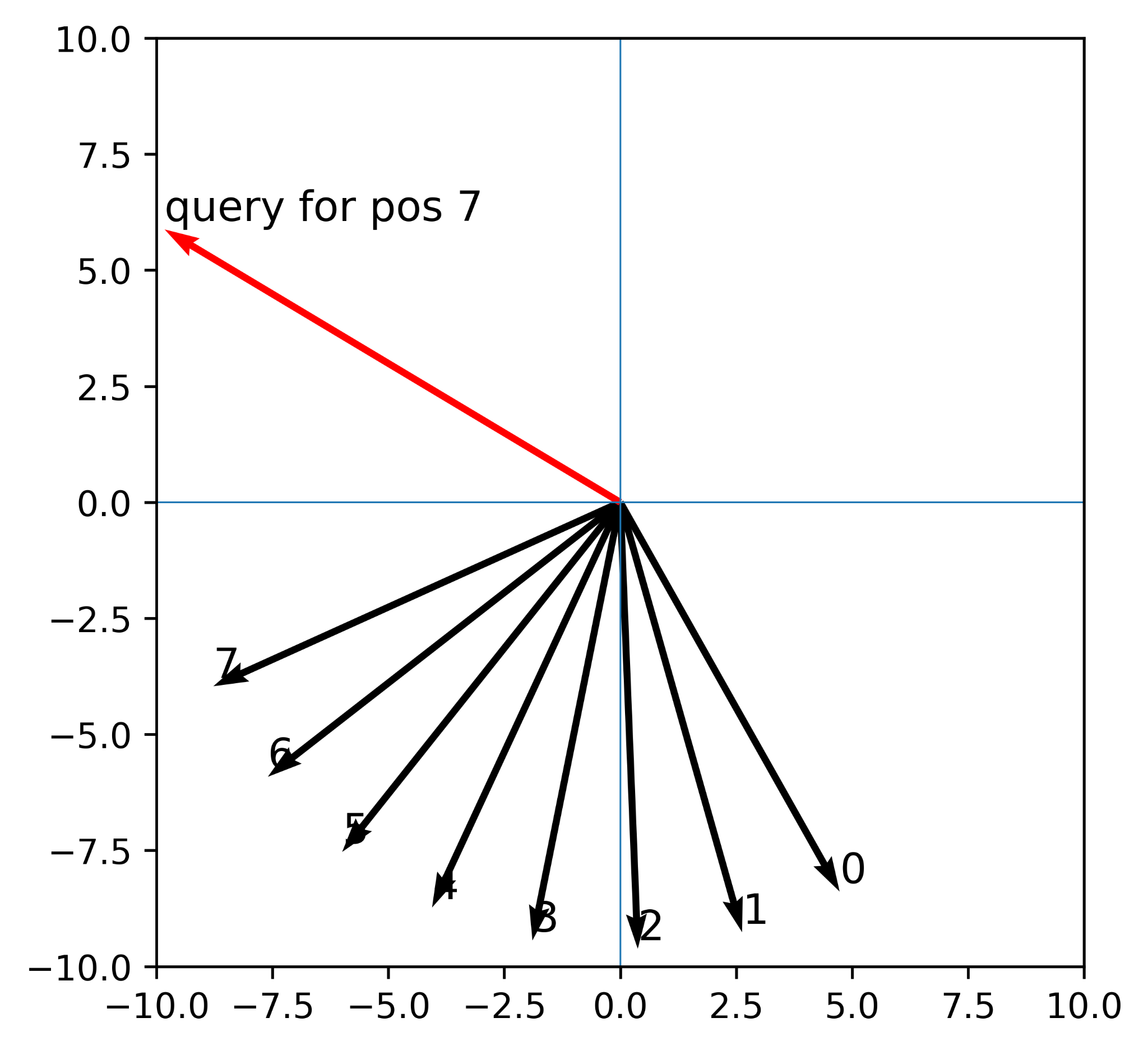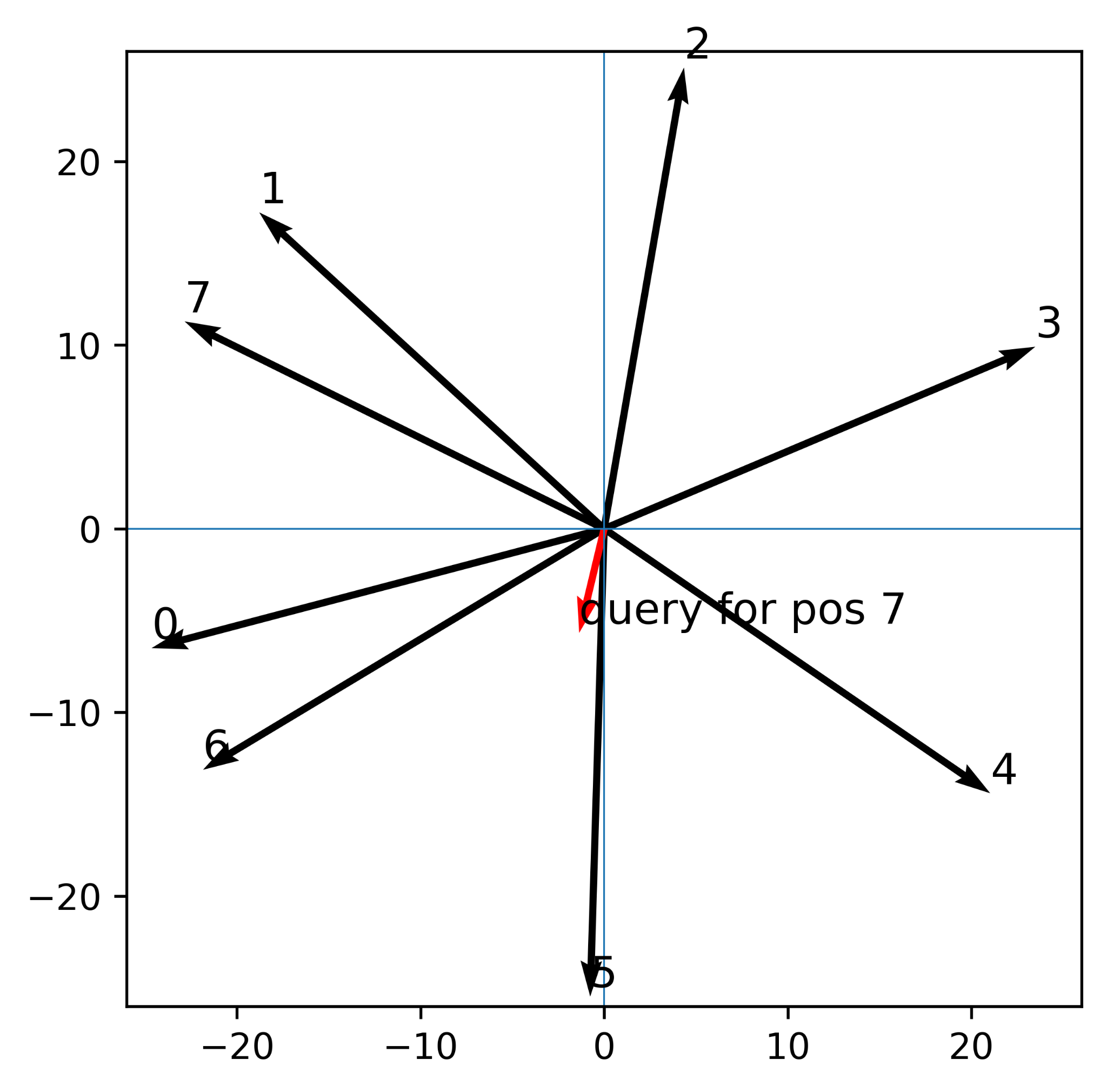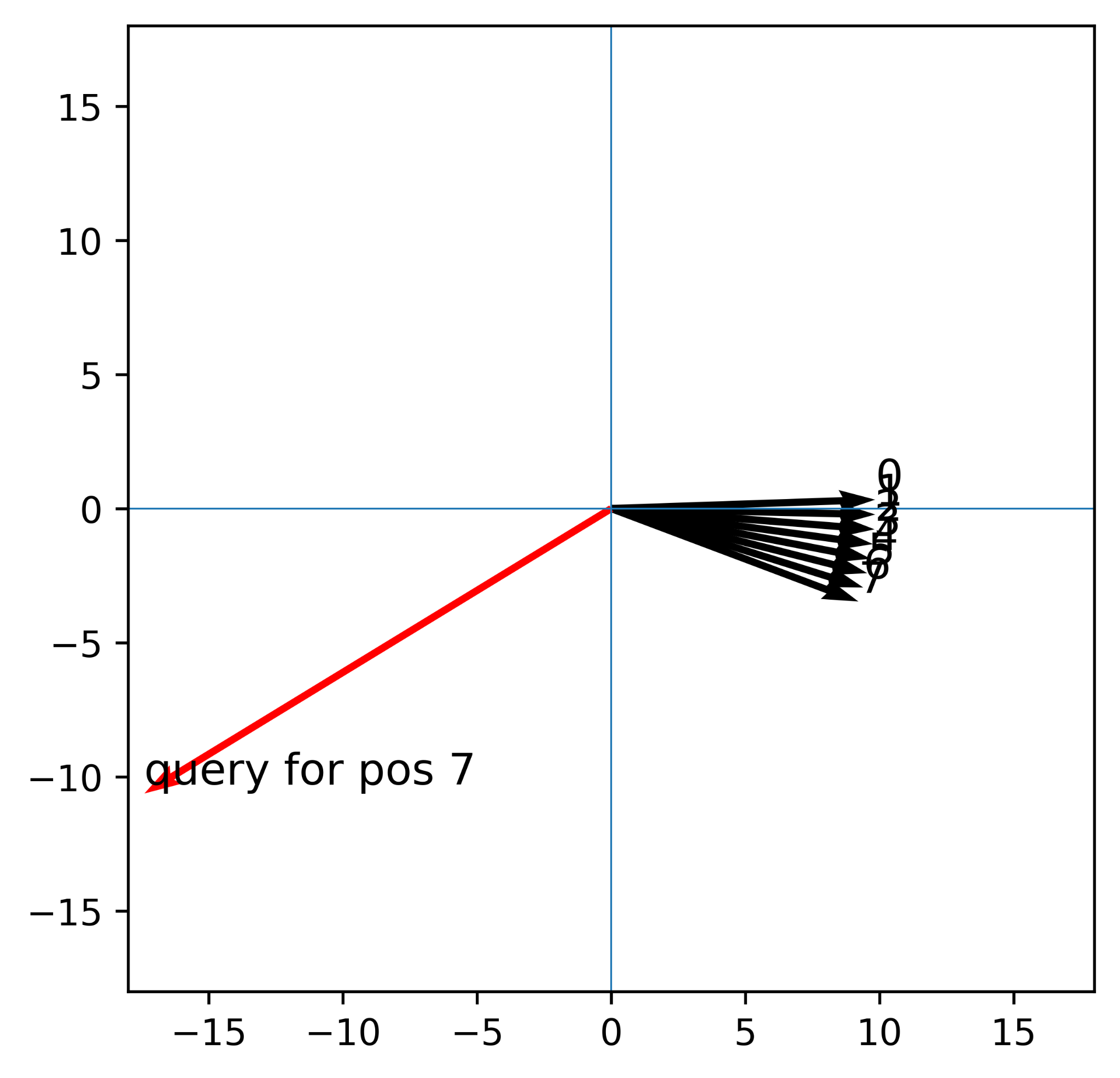 Woah, that looks different! Compare with figure 15.3. Other than the key for position 0, each key and the query was rotated. Look at the clockwise rotation from key 0 to key 1. Now look at the rotation from key 1 to key 2. You can see that the angle is the same. So key 1 is that angle away from key 0, key 2 is two times that angle away from key 0, and so on all the way through key 7, by which point we’ve started to circle around again.