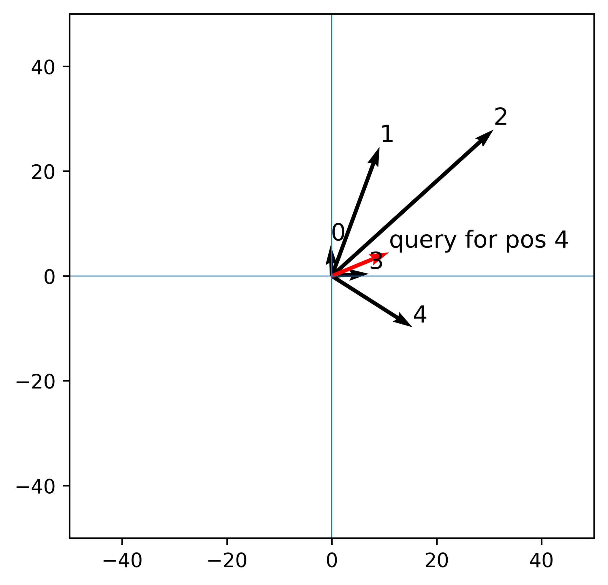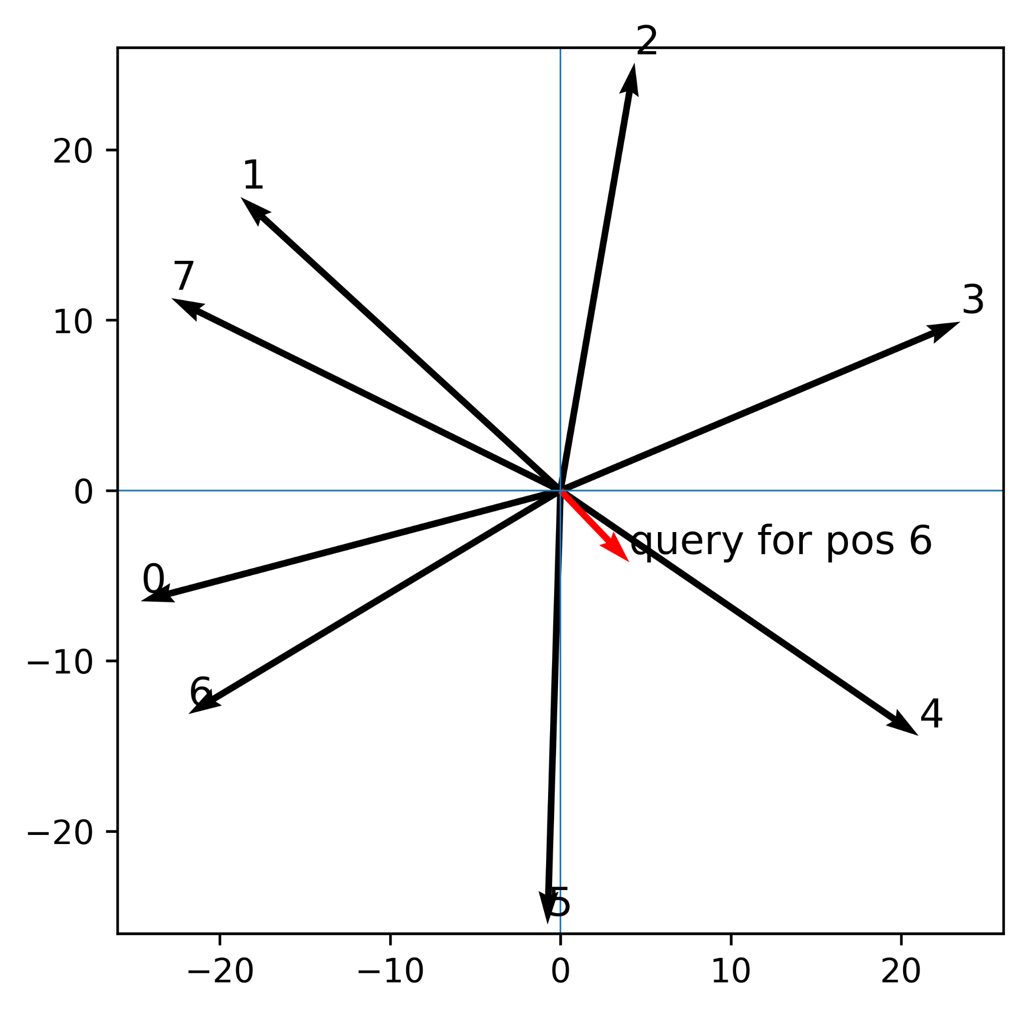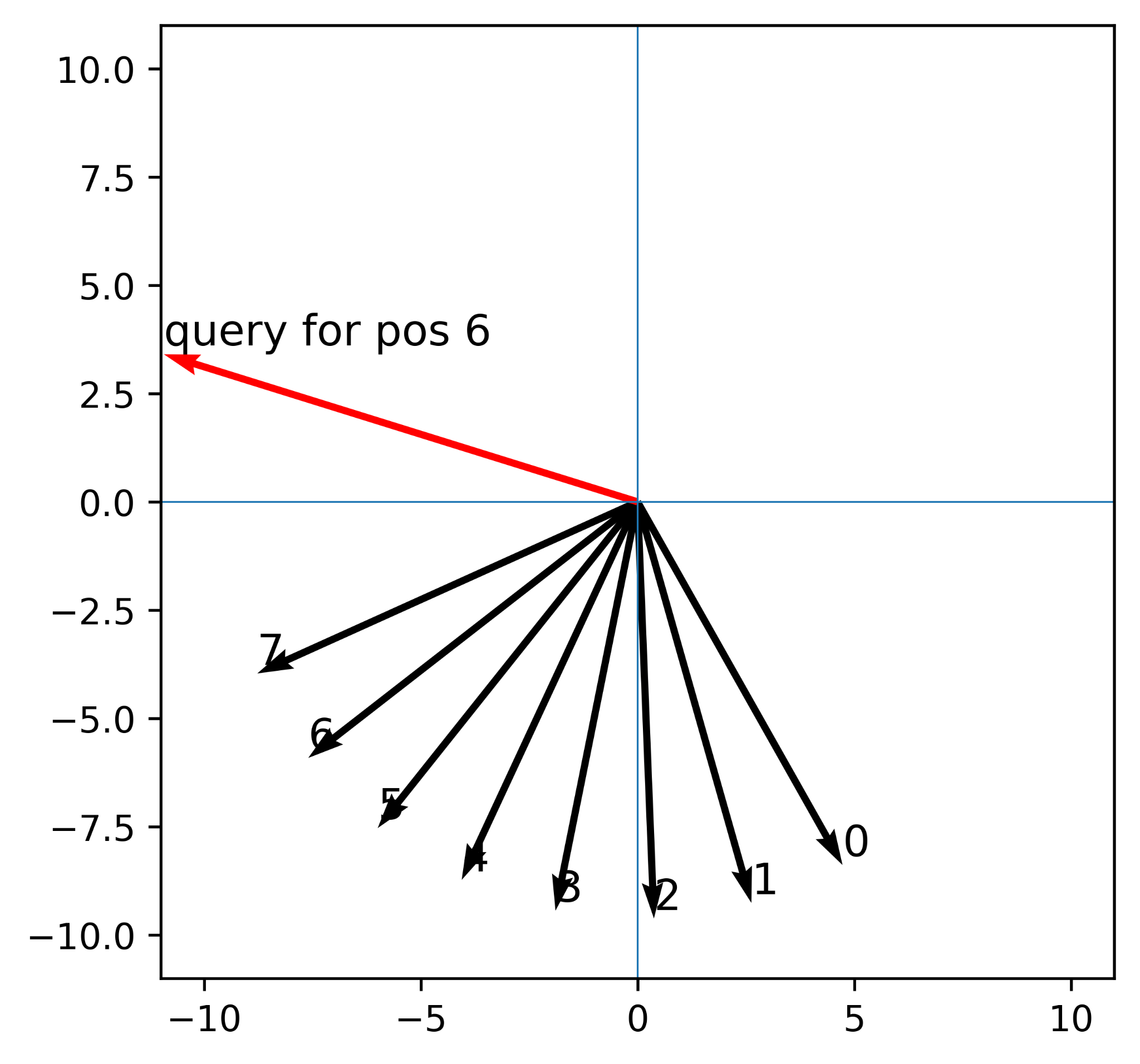 Woah, that looks different! Compare with figure 15.3. Other than the key for position 0, each key and the query was rotated. Look at the clockwise rotation from key 0 to key 1. Now look at the rotation from key 1 to key 2. You can see that the angle is the same. So key 1 is that angle away from key 0, key 2 is two times that angle away from key 0, and so on all the way through key 7, by which point we’ve started to circle around again.