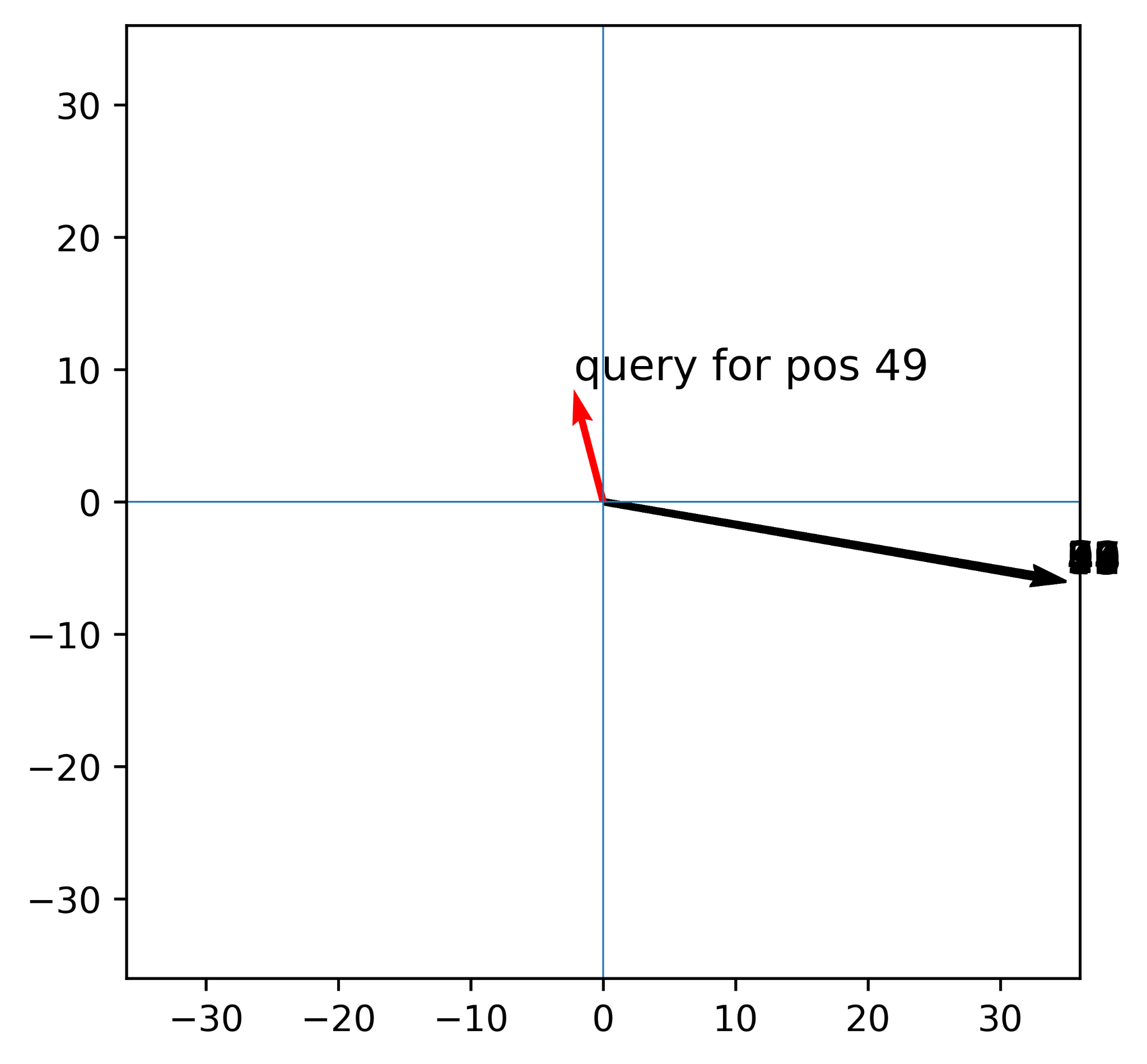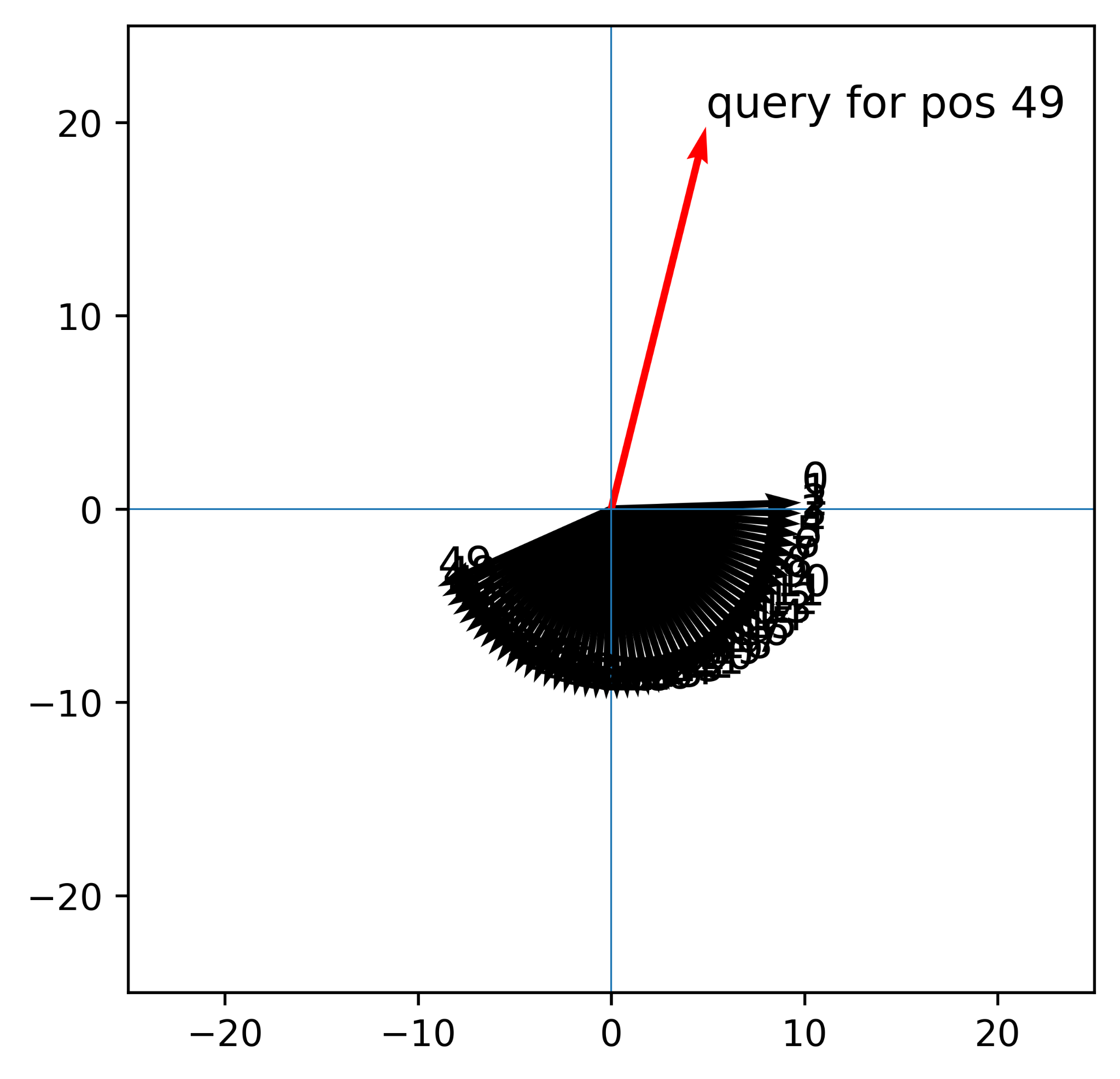 So that’s the idea. Take pairs of dimensions within the head (0 and 64, 1 and 65, all the way up to 63 and 127), treat them as two-dimensional vectors, and rotate them clockwise a certain number of times. The number of times is the position in the sequence. The angle of rotation is bigger for the lower dimension pairs (e.g. 0 and 64) and lower for the higher dimension pairs (e.g. 63 and 127). We don’t have to worry about numbers exploding out of range no matter how long our sequence is since rotation is like a clock and we just keep going around. (We do, though, need to make sure the angle of rotation is small enough in the bigger dimension pairs so we can get meaningful results from this whole rotation embed operation.)