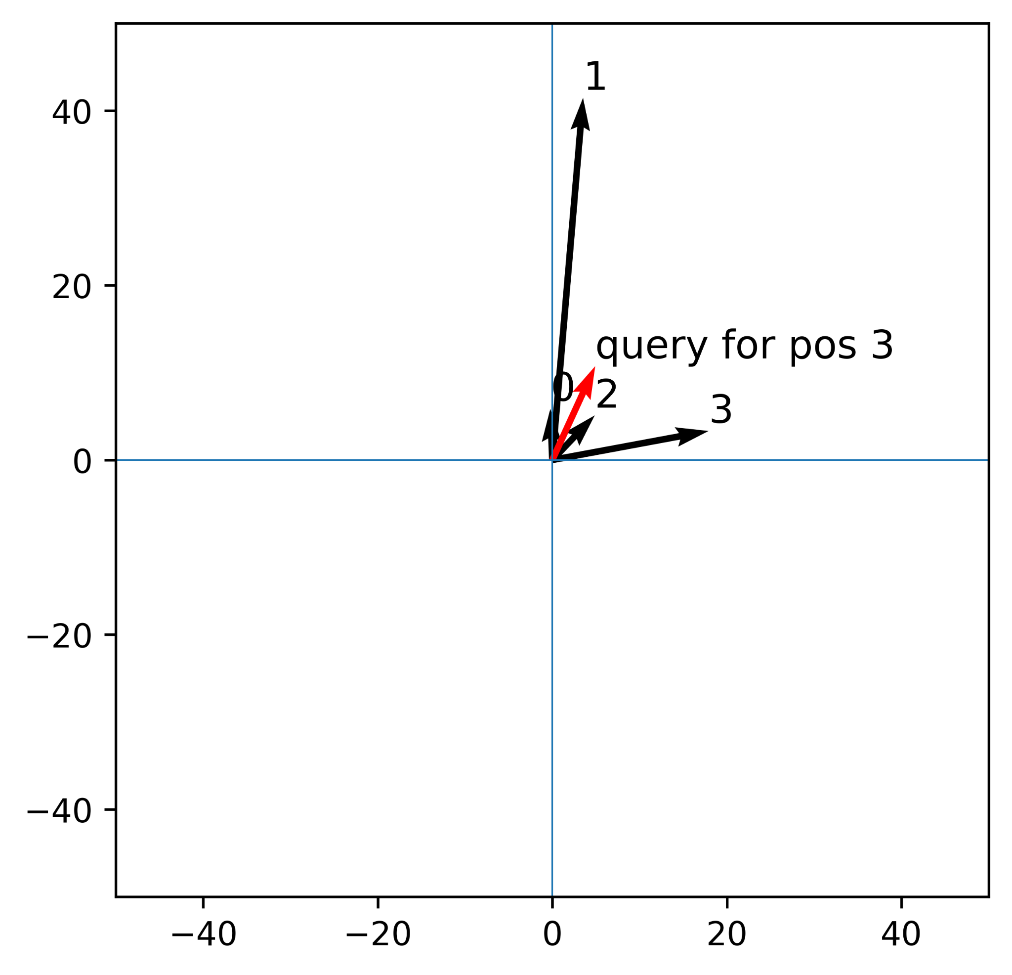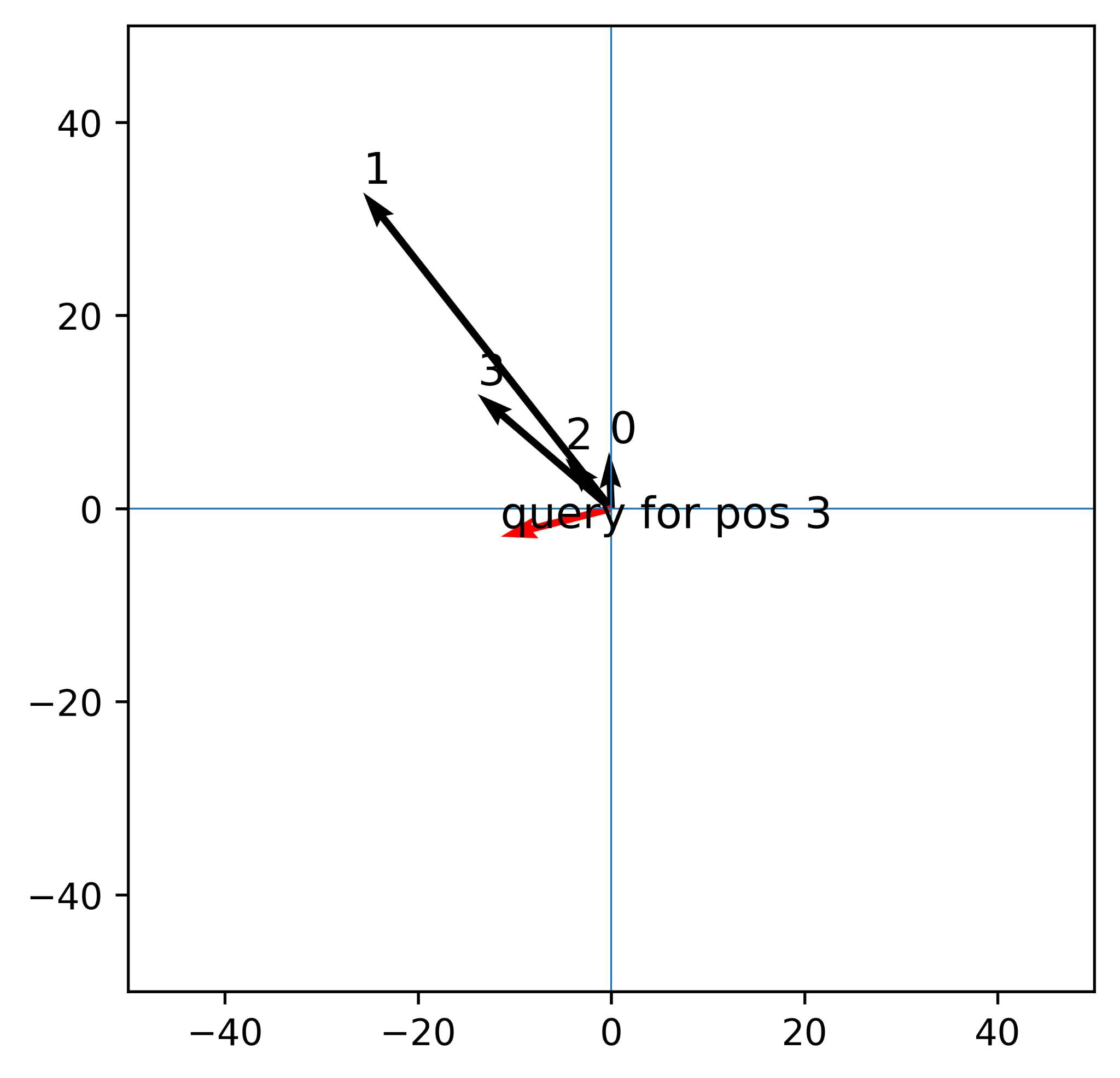Notice that the key for position 0 is unchanged. The key for position 1 rotates clockwise by a certain angle. The key for position 2 rotates right by twice that angle. If this were the whole picture (which it isn’t because we have another 126 dimensions in the head), the closest match for the query for position 3 (“France”) would be position 2 (“of”).