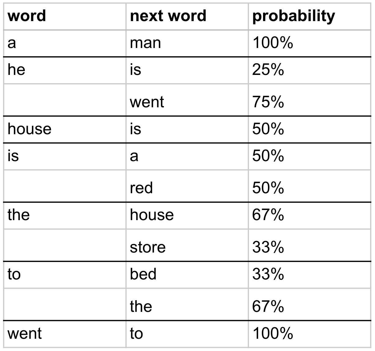 To see this, use the probabilities in the table above to generate new text. Start with “he” and choose the most probable next word: “went.” Now after “went” comes “to” and after “to” comes “the” and after “the” comes “house.” We’ve now generated a sentence: “He went to the house.” Sure, it happens to be one of the sentences in our corpus, but that’s not surprising with this tiny language. This also hints at how large language models like ChatGPT “accidentally" memorized (stole?) and are able to regurgitate full newspaper articles: see the New York Times lawsuit against OpenAI.
