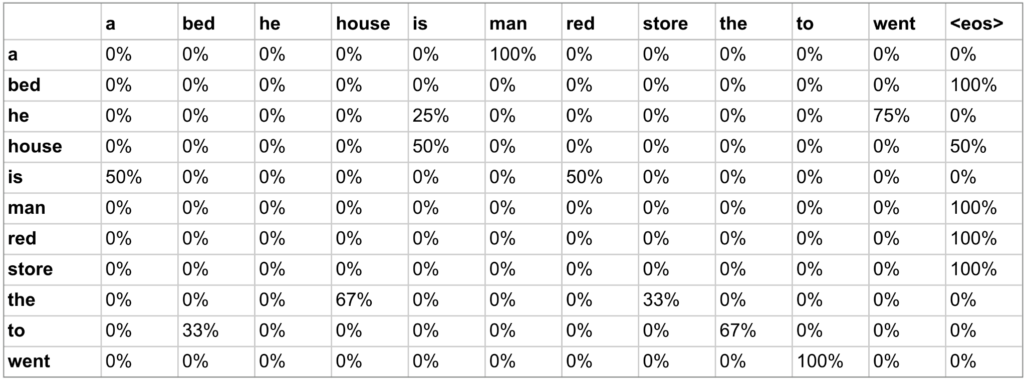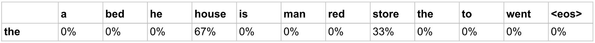 Here’s a table with the next word probability distributions for all of the words. I also added one more “word” into our vocabulary: <eos> meaning end of sentence, like a period. I brushed over this detail above, but without it, the probabilities in each row won’t add to 100%.