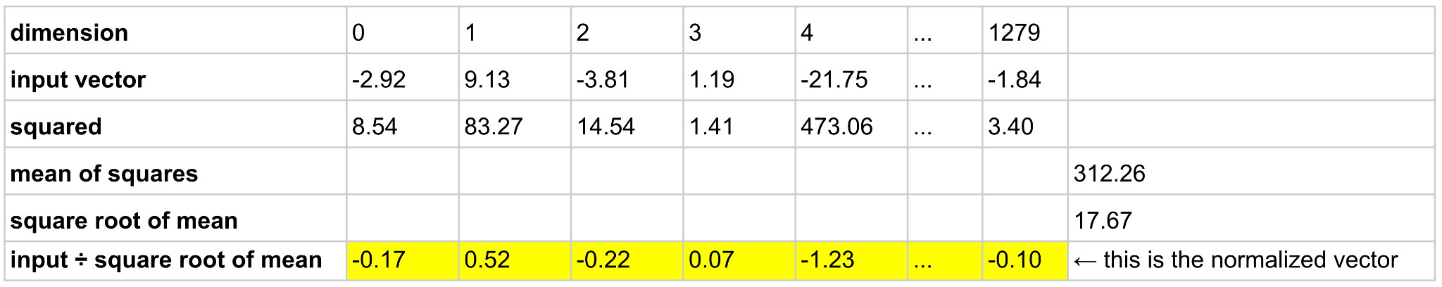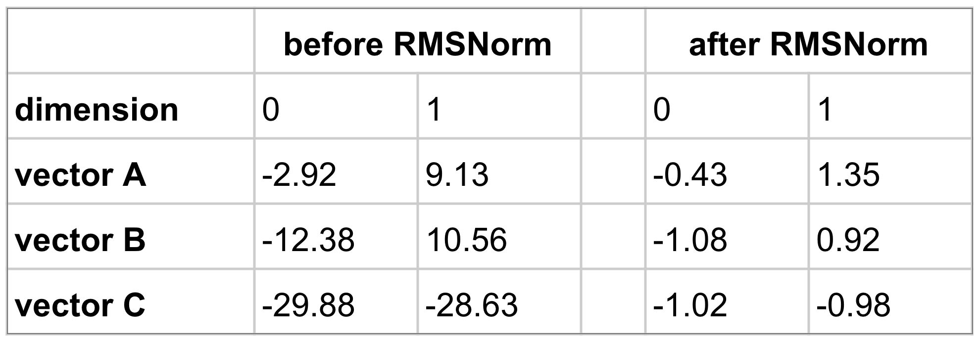The calculation is in the name: Root Mean Square Layer Normalization. Square each element in the vector, take the mean, take the square root, and divide this into each element. The beauty of Zhang and Sennrich’s research, and prior research into layer normalization, was to show that, counterintuitively to people at the time, this all you need to do—no need to calculate the mean or standard deviation on a bigger sample of data flowing through the model and no need to learn any parameters.