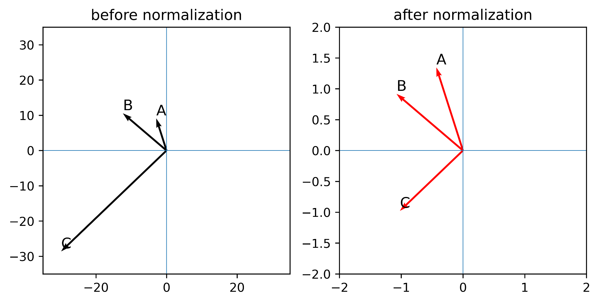 Notice that the angles are the same after normalization but the lengths change dramatically. Before normalization vector C extends almost to (-30, -30). After normalization all three vectors have a length of 1.4 (the square root of 2).