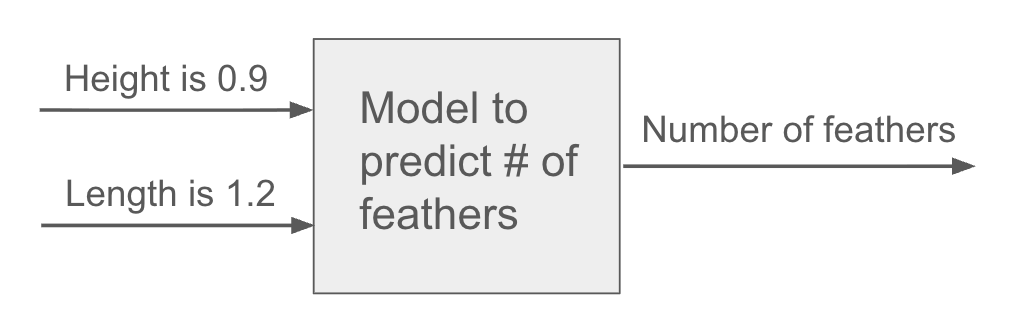 Think of this model as a machine. It takes two inputs: the height of the turkey and the length of the turkey. It gives one output: its prediction for the number of feathers.