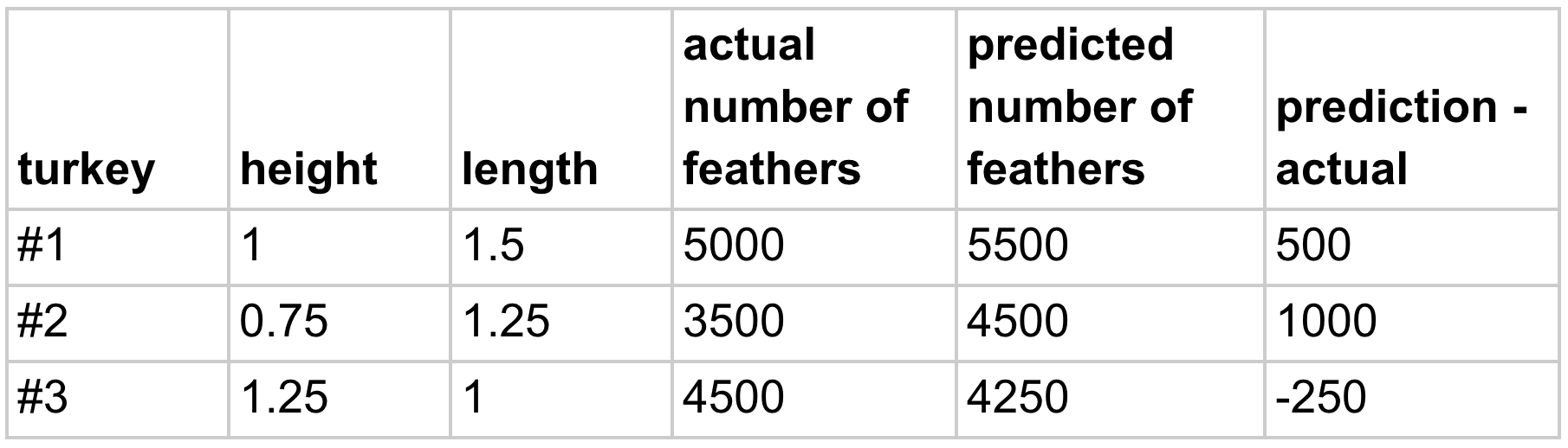 The column labeled “prediction - actual” from table 3.2 is now called error. That makes sense because it is the error in our prediction. For turkey #1 the prediction is 500 feathers too high, for turkey #2 it’s 1000 feathers too high, and for #3 we’re 250 short.