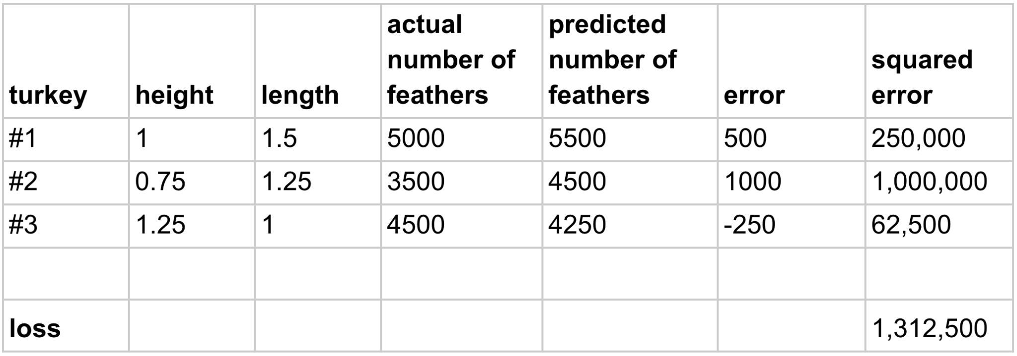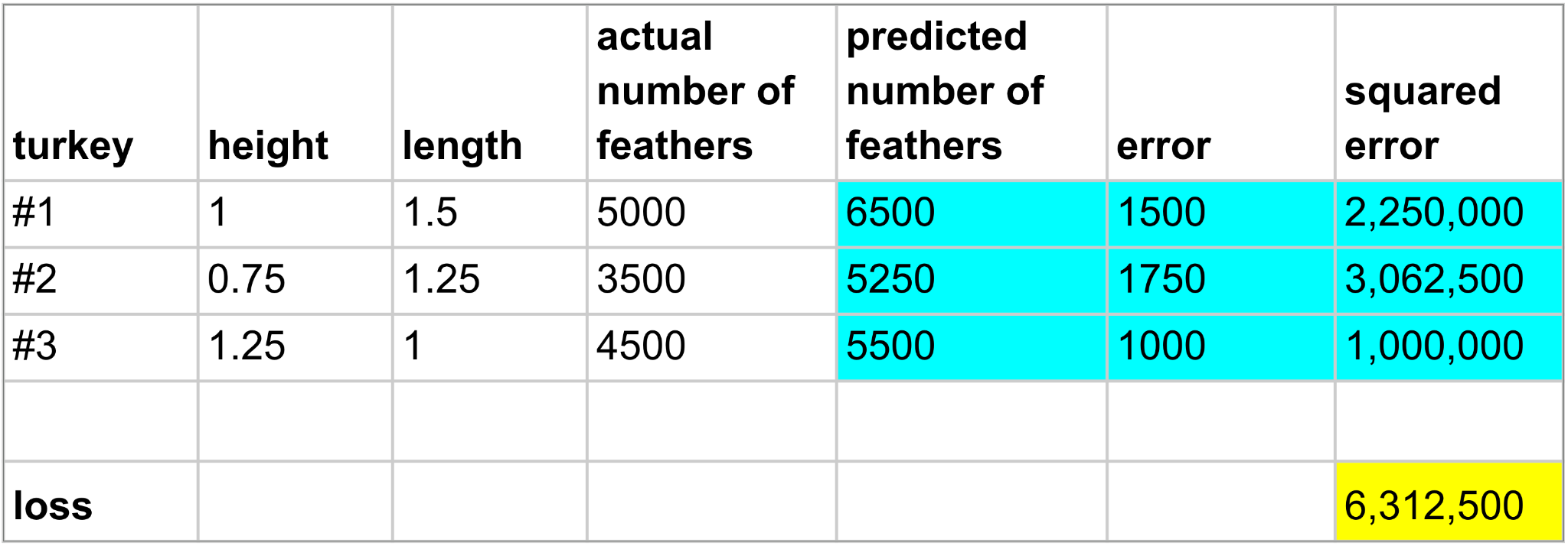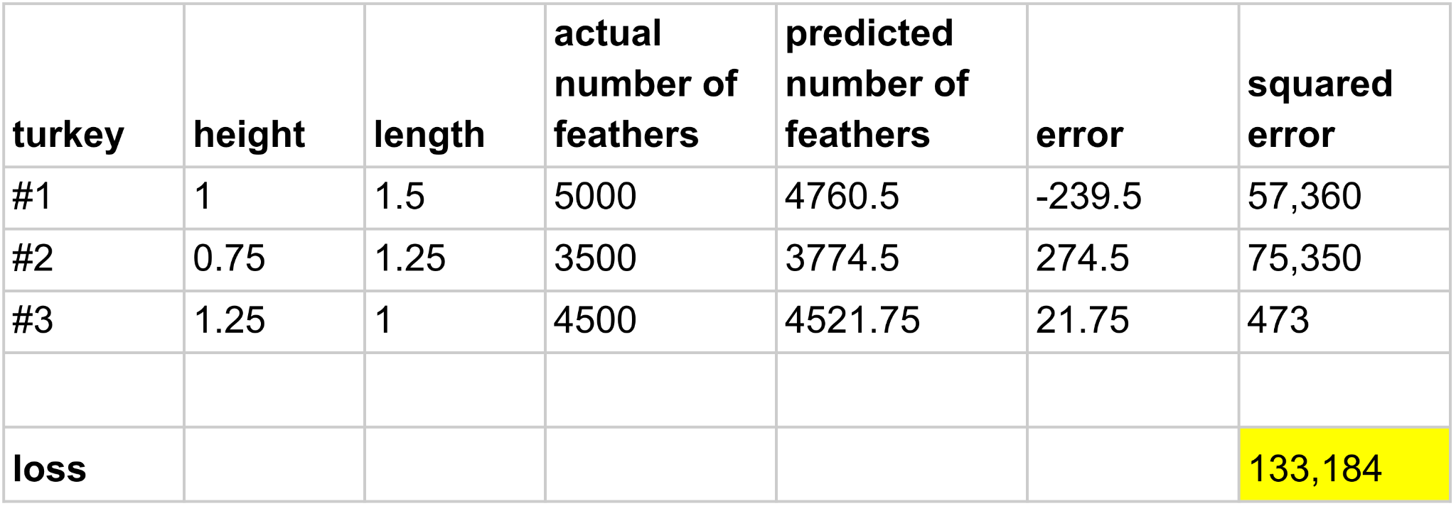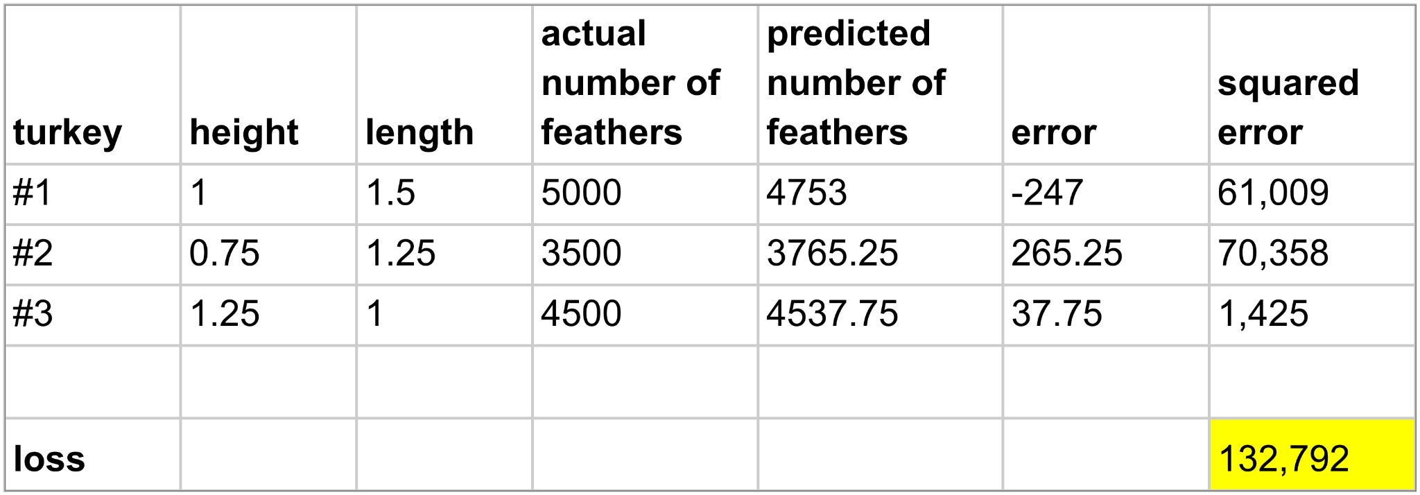 loss = (turkey #1 error)2 + (turkey #2 error)2 + (turkey #3 error)2