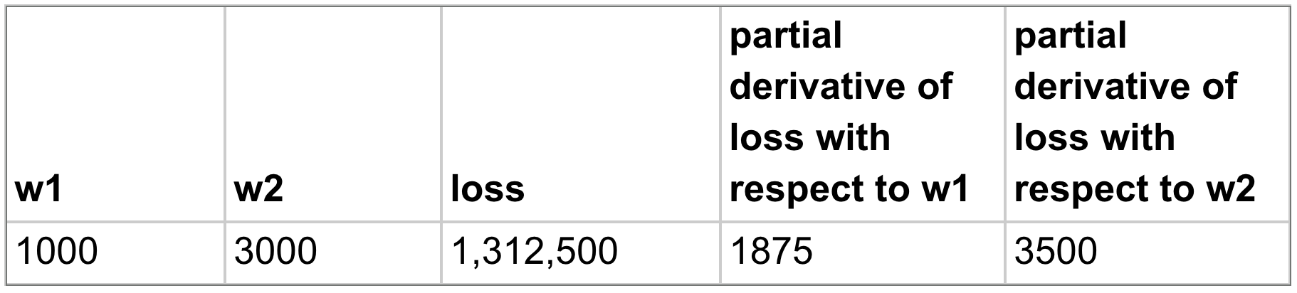 Partial derivative of loss with respect to w1 = 6.25(1000) + 7.375(3000) - 26500 = 1875