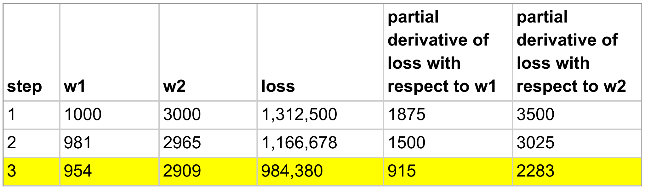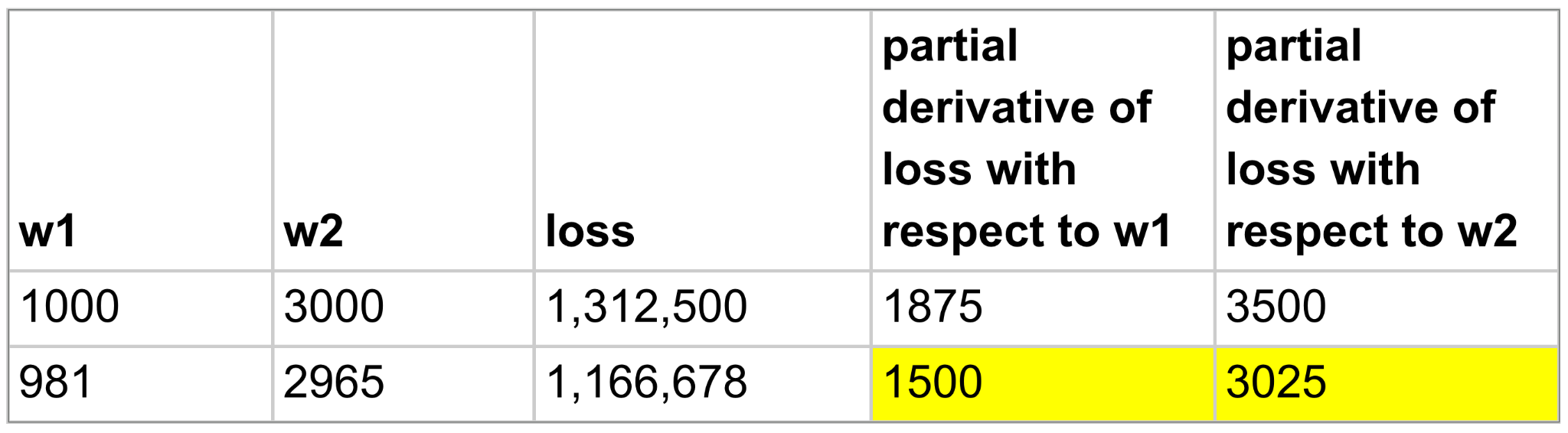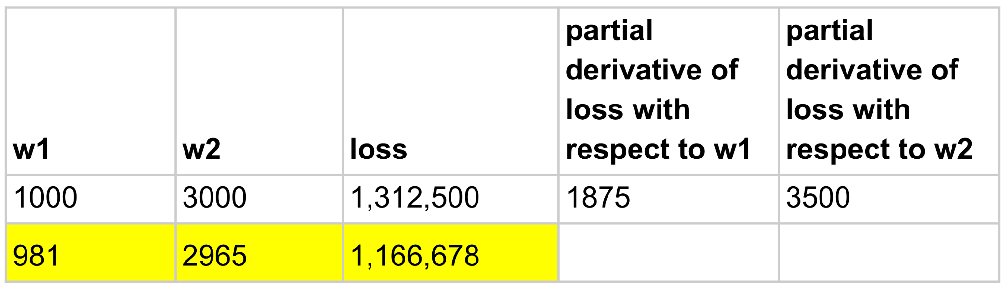 Hooray! Loss came down. Plug the new w1 and w2 into our partial derivative equations above and we can add the partial derivatives at these new weights to the table too: