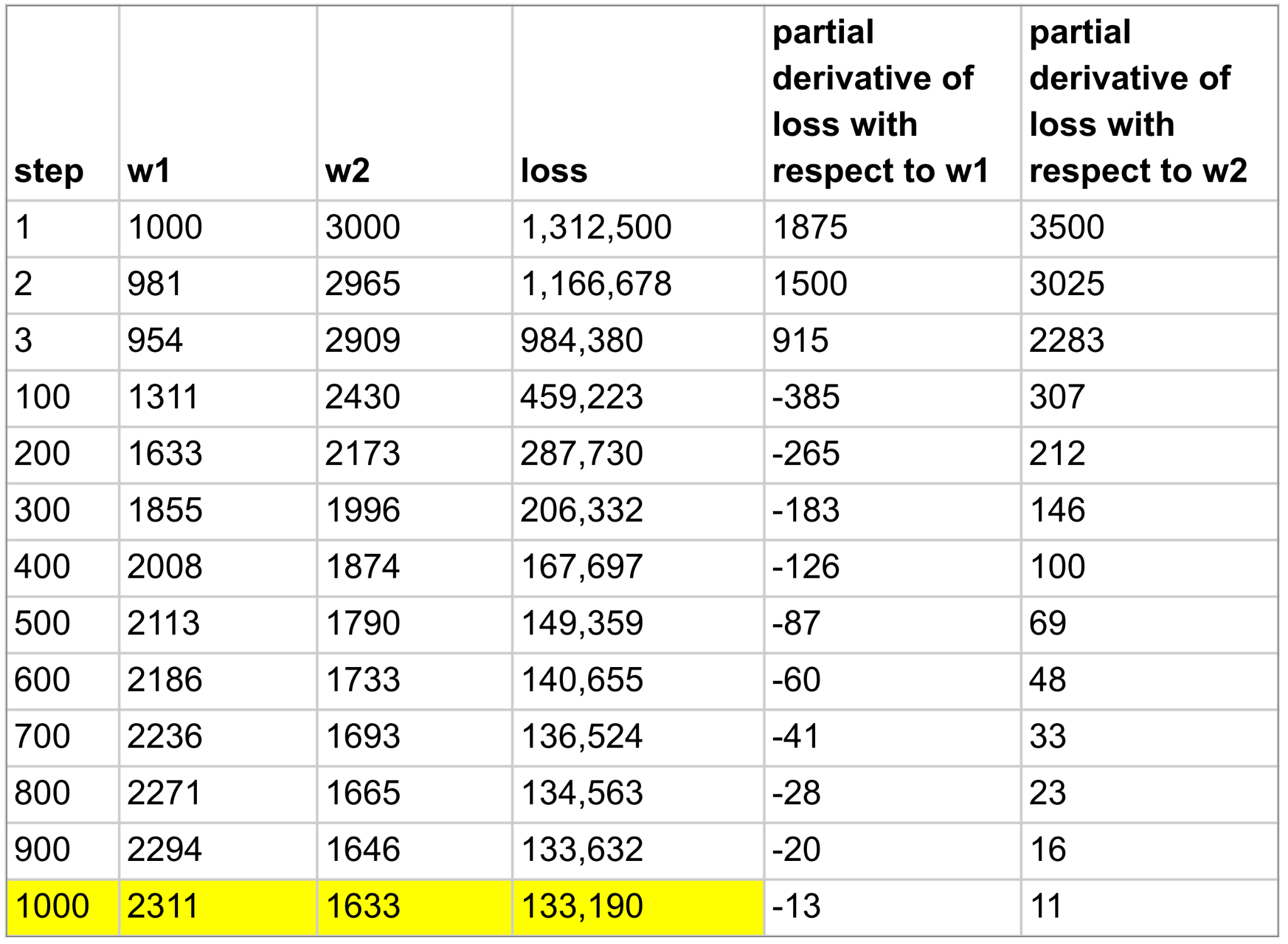 You may be itching to know how close we got to the optimal answer. In the future we’ll work with models where that’s tricky or impossible to figure out. Here, though, it’s easy to compute the w1 and w2 that minimize loss. As I mentioned above, people figured out how to solve these problems a long time ago and without doing 1000 steps of computation. Set both partial derivatives above to 0 and you’ll have two equations and two variables. Solve for w1 and w2 and you’ll get (rounded to nearest whole number):