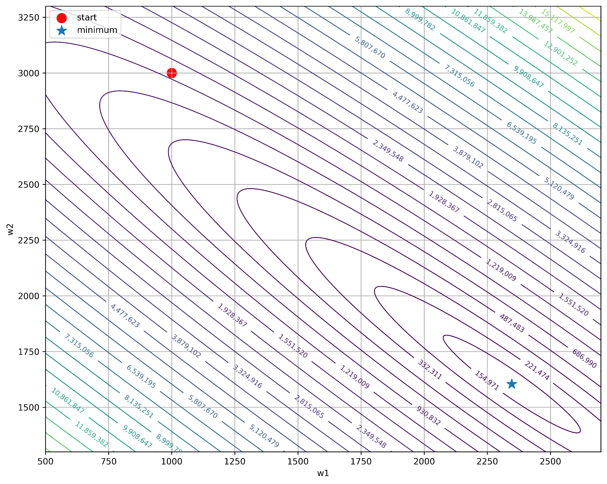 loss = (5000 - ((1)(w1) + (1.5)(w2)))2 +