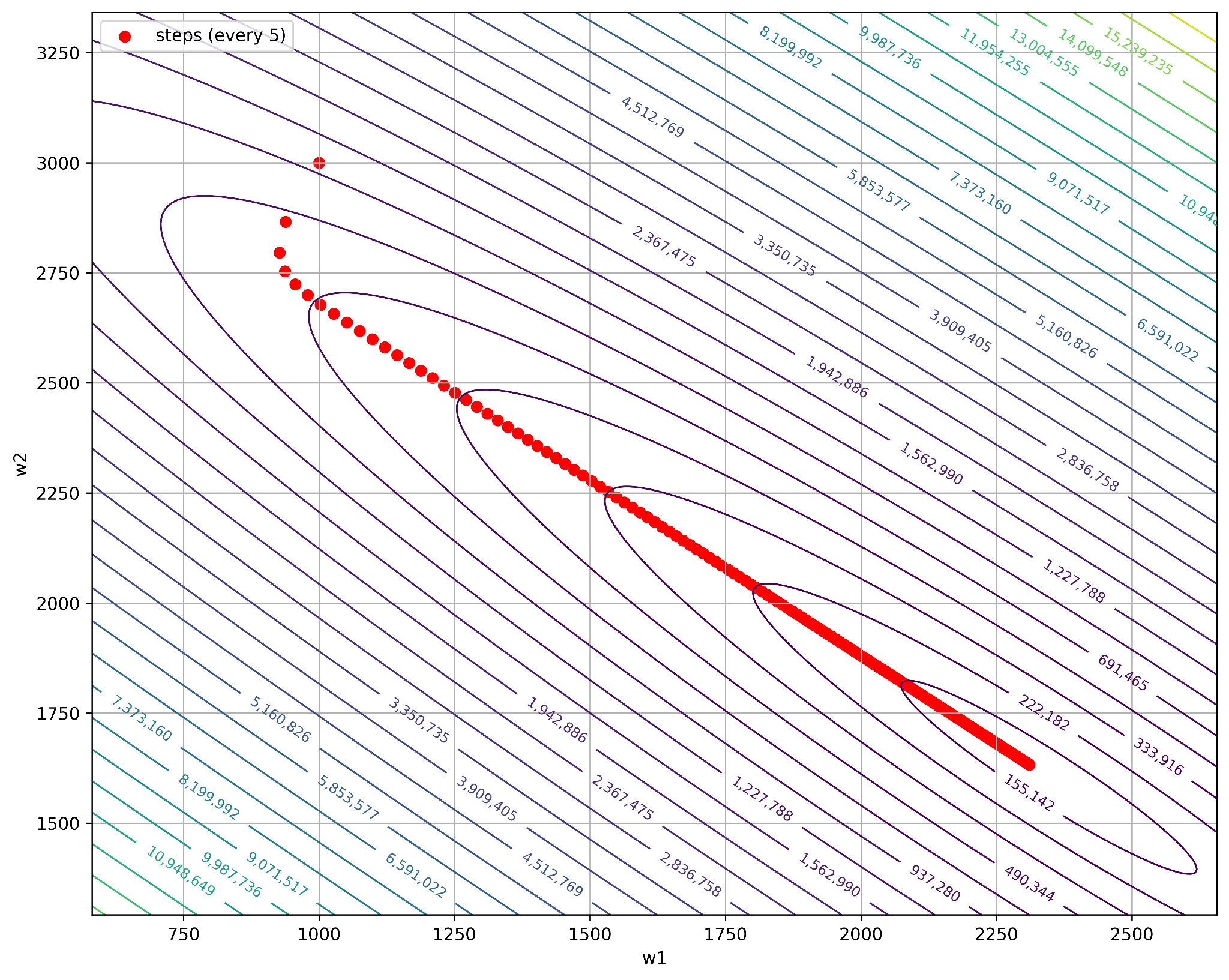 Partial derivative of loss with respect to w1 = 6.25(w1) + 7.375(w2) - 26500