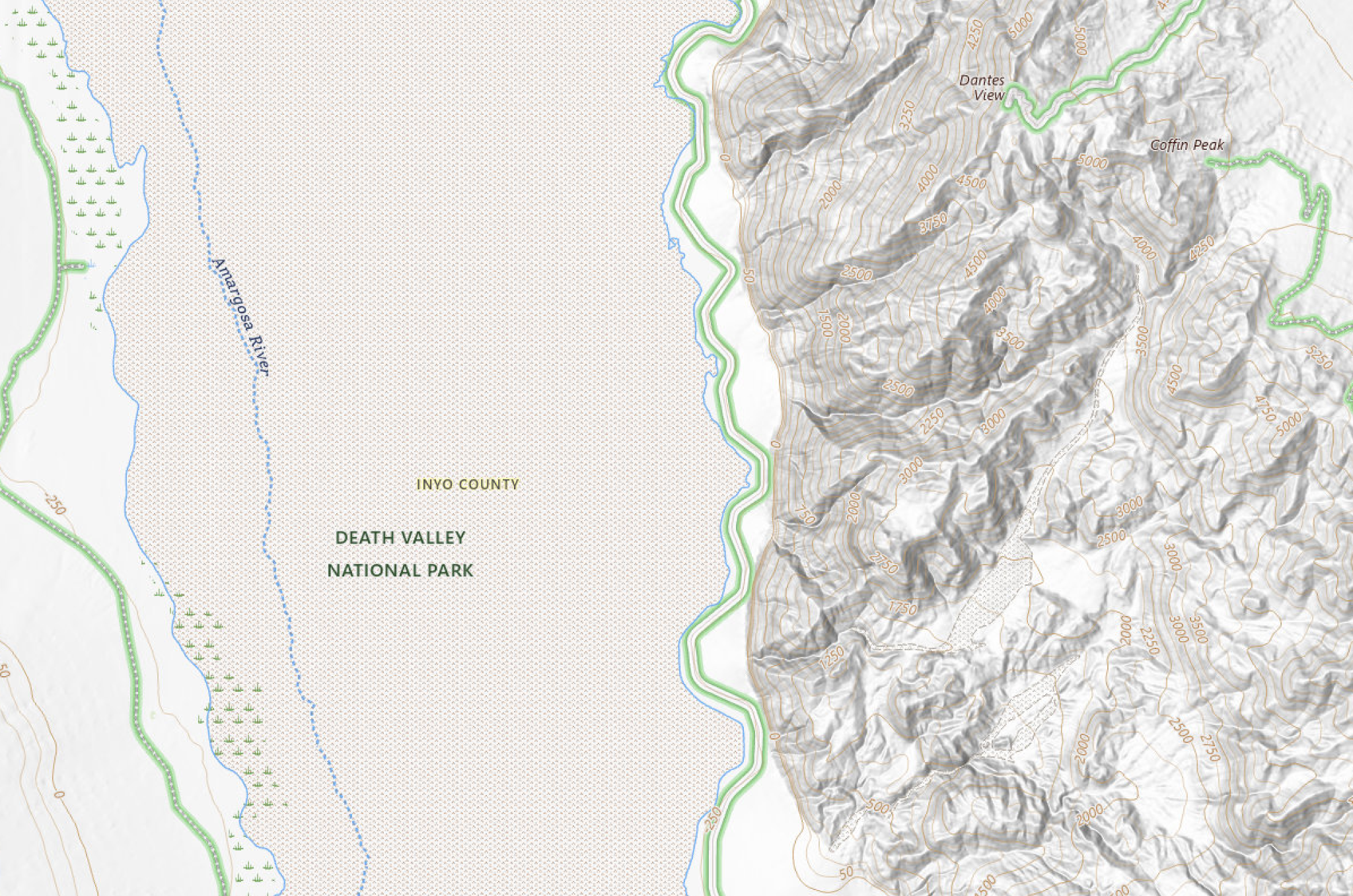 Imagine you were placed somewhere in Death Valley National Park and your goal was to hike to the lowest point in the park, which is also the lowest point in the United States: Badwater Basin with an elevation of 282 feet below sea level. If the park were shaped like a perfectly round cereal bowl then sure, no matter where you started, as long as you always stepped in the steepest descending direction, you would walk directly to the lowest point. But here’s a topological map of part of the park. If you started at a peak on the right somewhere, and always took steps in the steepest local descending direction, you might end up in the basin, but your path would be winding.