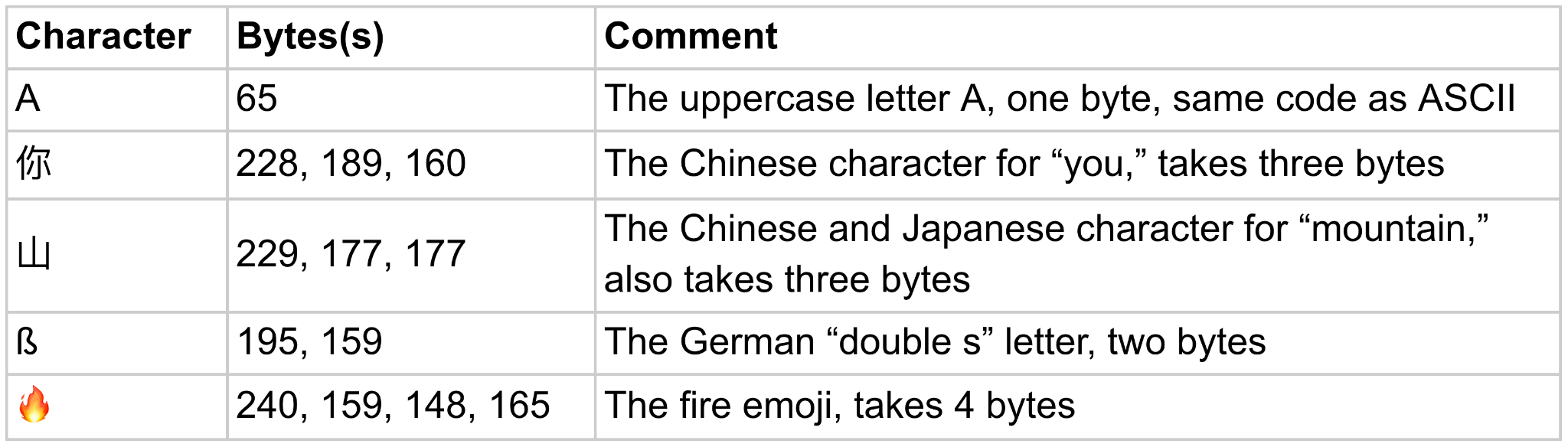 Unlike ASCII, UTF-8 uses different numbers of bytes to encode different characters. I’ll show you a few examples so you can get the idea: