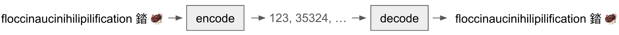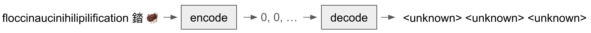 It used to be common practice for tokenizers to encode words not in the vocabulary as unknown like in figure 7.3. The problem is when you want to train a model on all text you can possibly find and that’s billions or even trillions of characters out in the wild, you’re going to see even rare things, and we don’t want to deprive the model of the chance to learn from or generate those rare things. If our tokenizer is lossy and outputs unknown tokens, then “floccinaucinihilipilification,” “錔,” and “🦃” will all look identical to the model: the unknown token.