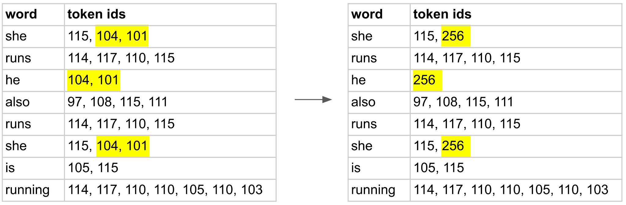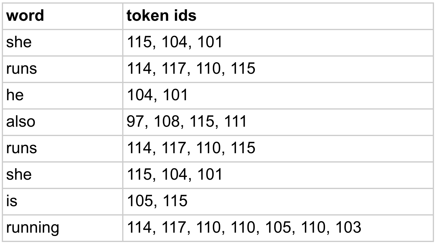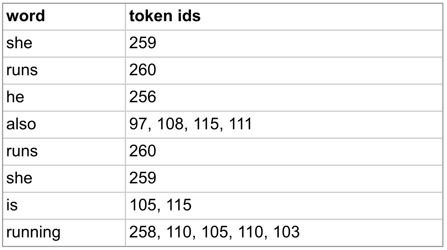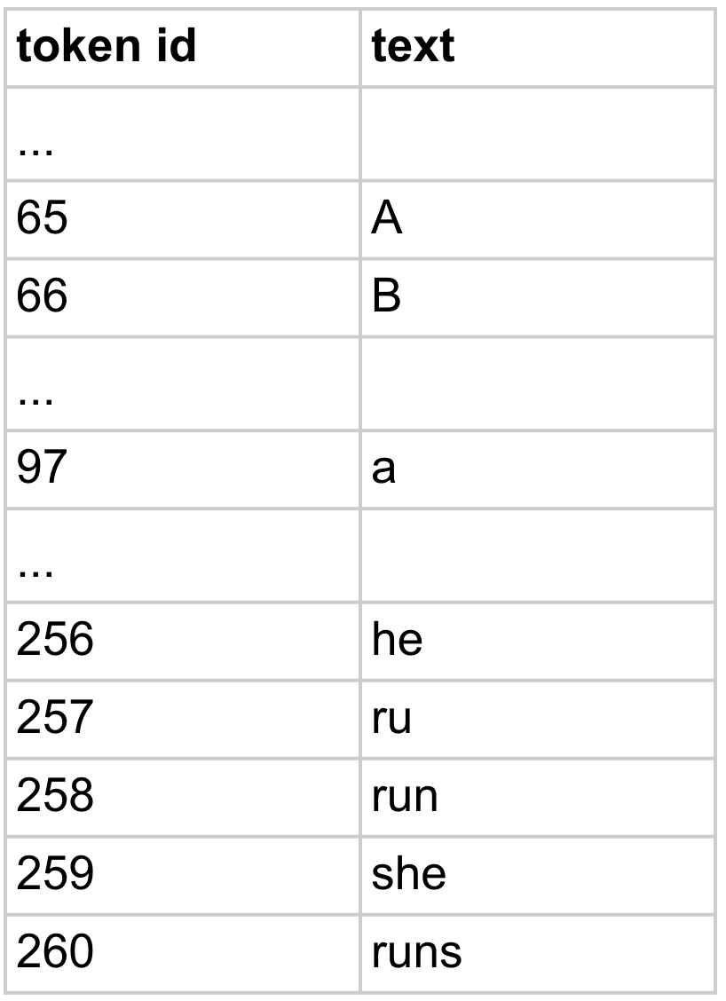Notice that we replace the pair of tokens 104 and 101 with the single token 256 everywhere. Next up we merge pair 114 and 117 (“ru” in both “runs” and “running”) into new token 257. We keep going in this way until we get to the token with ID 260. (This gives us a total vocab size of 261 since we start at 0.)