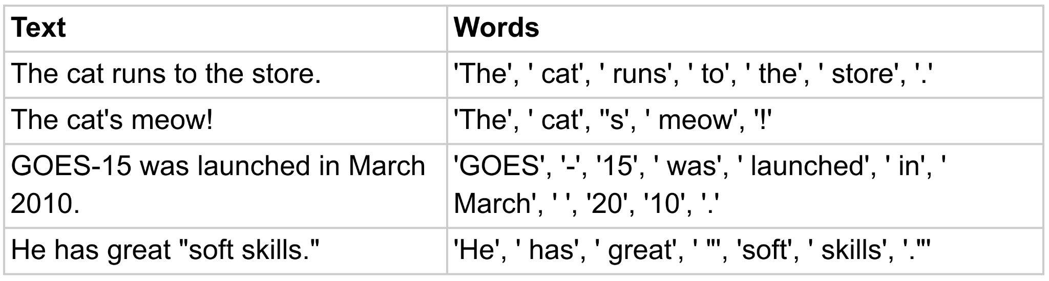 Another thing I glossed over before but we have to deal with in the real world is breaking text up into words. I listed three sentences above (“she runs,” etc.) and then listed their words in table 7.3 without ever being clear about how I came up with the words. I also didn’t say what happened to the spaces or periods, and of course in the real world text we’ll see numbers, hyphenated words, quotes, apostrophes, parenthesis, and much more. We somehow have to be able to take any text and break it into words. These may not be words as we think of them as English, but they serve as boundaries beyond which we don’t merge.