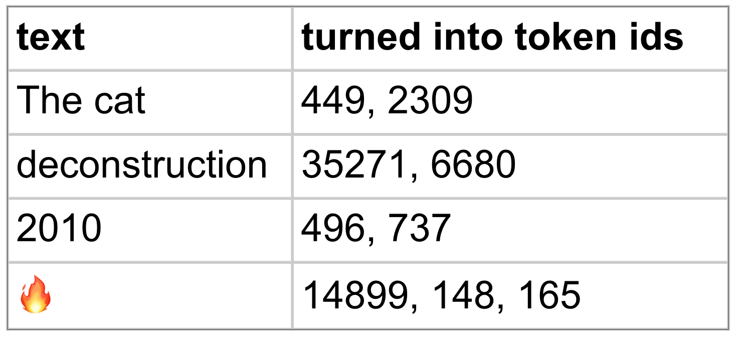 In chapter 5 you hopefully built an appreciation for how when we were training to learn the weights for our turkey feather model, and later when we were plugging turkeys into the model to get out a prediction, we worked with matrices of numbers. The same is true when working with language. If we’re going to want to feed the sentence “He went to the store” into a model as training data, we’ll want to first convert it to numbers. A tokenizer encodes text as a list of tokens. In this case: 2, 10, 9, 8, 7. (These days, images, movies, and sound can also be encoded as tokens.)