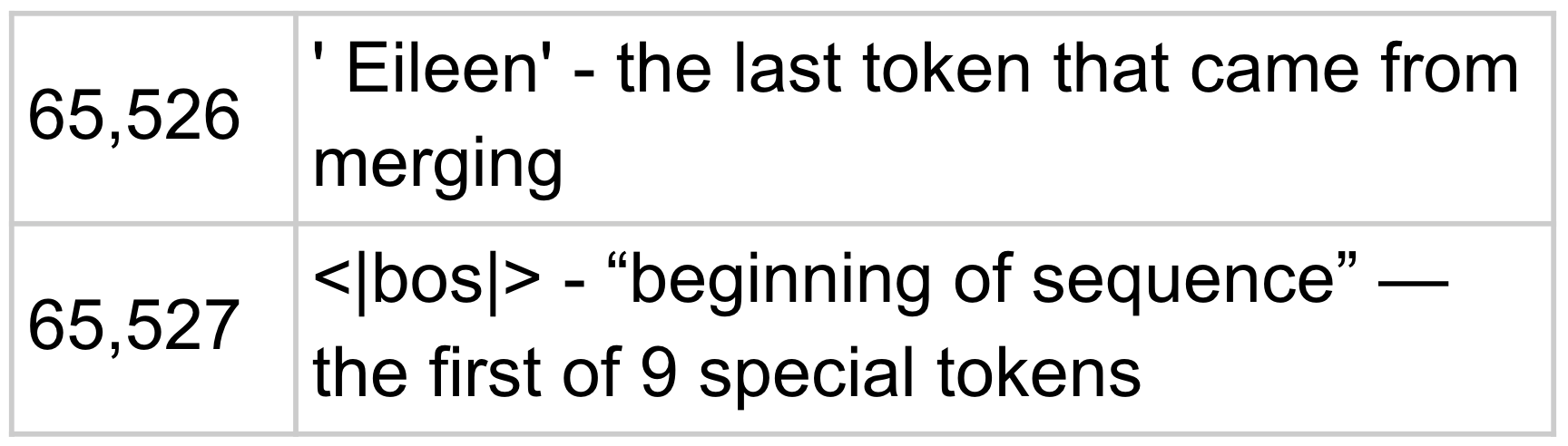 We’re just about done with the tokenizer and ready to move on to using the tokens. One last point to keep in mind: Since our model will take tokens in and predict tokens, it’s going to turn out to be helpful to have special, reserved tokens that signify specific information that can never appear in normal text. One example is beginning of sequence. There will be others. The point for now is to leave room for them so that the total vocab size still ends up at our desired number, 65,536 in this case.